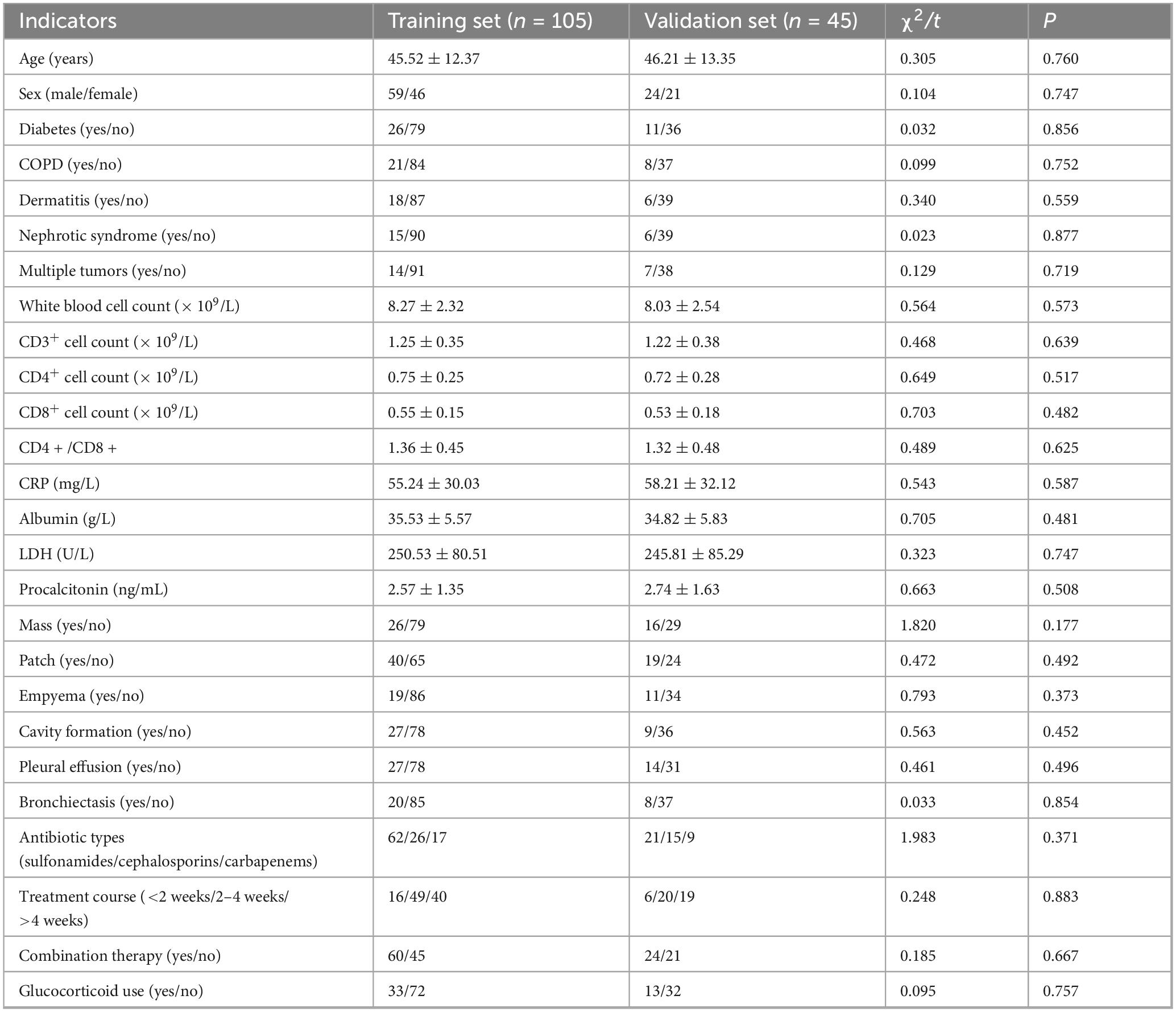 The patients’ clinical data were carefully collected, including age, gender, underlying diseases (such as diabetes, COPD, dermatitis, nephrotic syndrome, multiple tumors), white blood cell count, lymphocyte subsets (CD3 + cell count, CD4 + cell count, CD8 + cell count, and CD4 + /CD8 + ratio), C-reactive protein (CRP), albumin, lactate dehydrogenase (LDH), procalcitonin (PCT), imaging features (masses, consolidation, empyema, cavity formation, pleural effusion, bronchiectasis), types of antibiotics used (sulfonamides, cephalosporins, carbapenems), treatment courses (<2 weeks, 2–4 weeks, >4 weeks), whether combination therapy was used, and whether glucocorticoids were administered.