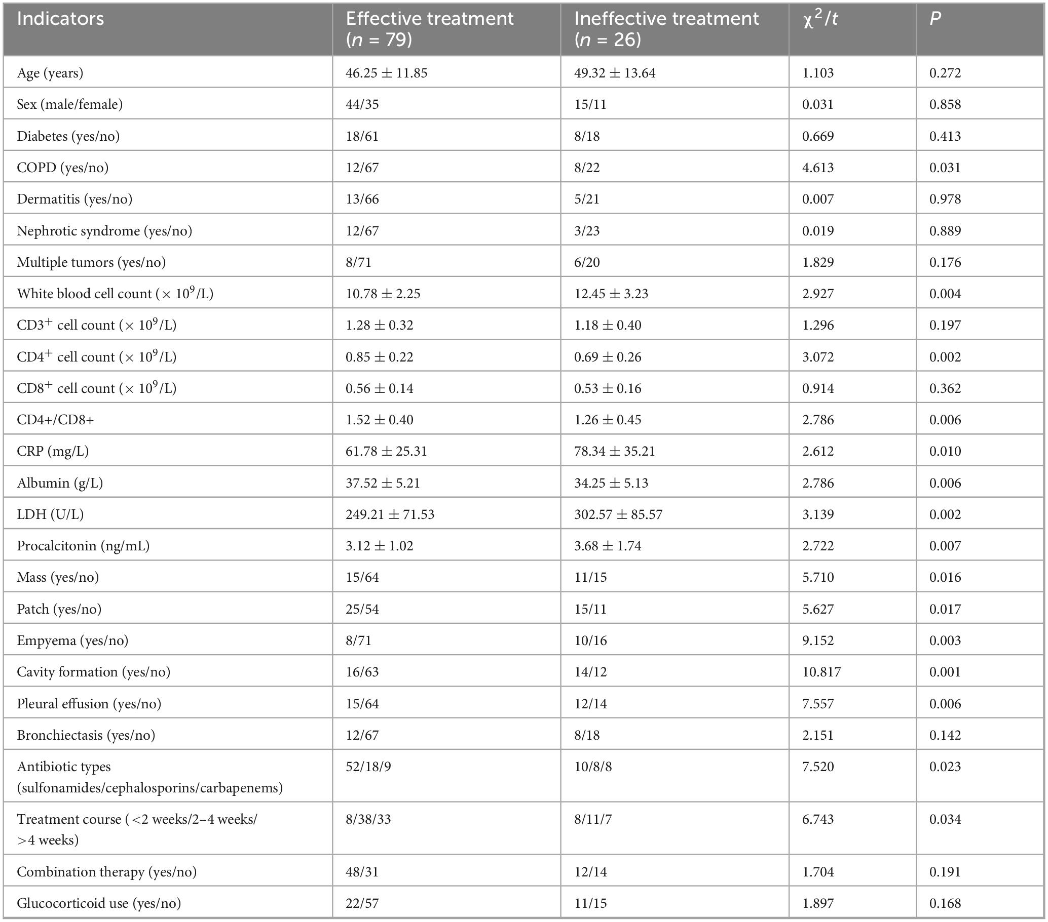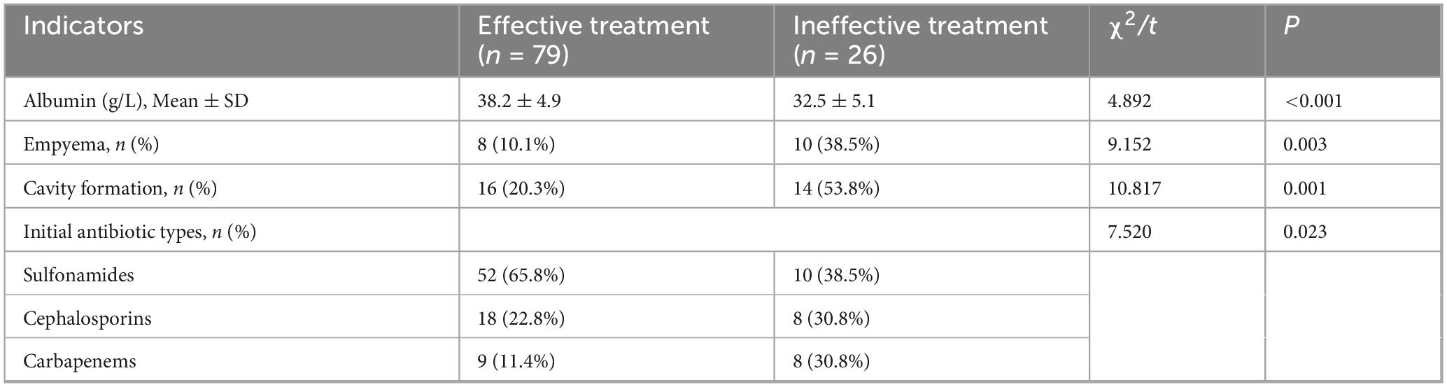 To clarify the baseline characteristics of the four independent influencing factors at disease onset (first assessment upon admission), baseline data of the effective treatment group (n = 79) and ineffective treatment group (n = 26) in the training set were compared and analyzed. Significant differences were observed in albumin levels, empyema, and cavitary lesions between the effective and ineffective treatment groups, supporting their utility in early prognosis (P < 0.05) (Table 5).