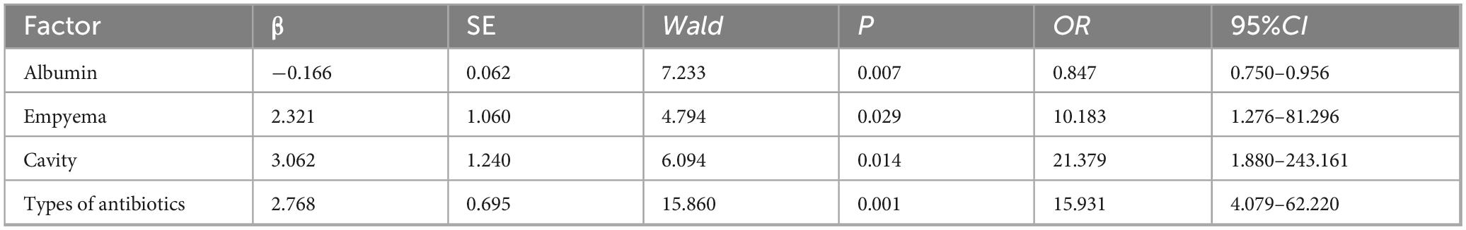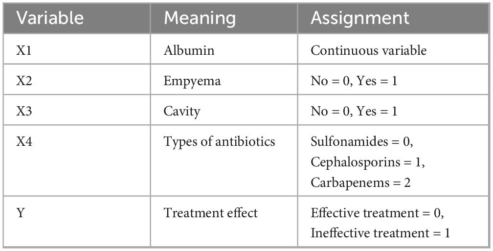 With the treatment outcome as the dependent variable (1 = ineffective, 0 = effective), and the factors with P < 0.05 in the univariate analysis as covariates, a multivariate logistic regression analysis was further conducted (the variable assignment table was shown in Table 3). The results showed that albumin, empyema, cavitation, and the types of antibiotics (sulfonamides/cephalosporins/carbapenems) were independent risk factors affecting the treatment outcome of Nocardia farcinica pneumonia (P < 0.05) (Table 4).