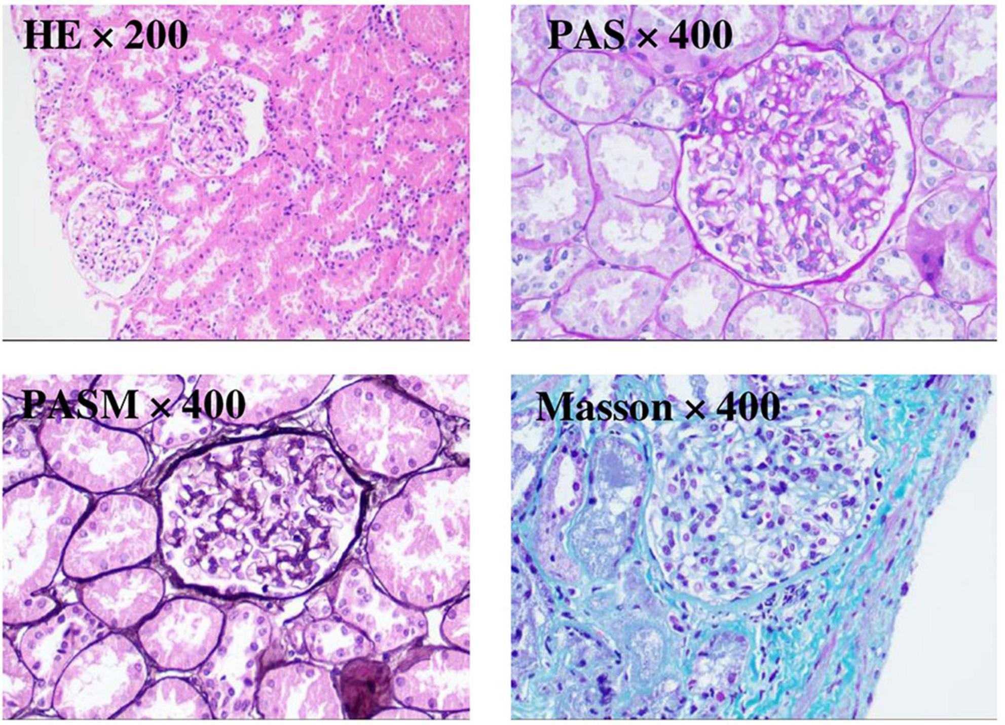 Figure 1. Renal biopsy was examined under light microscopy with HE staining (×200), PAS staining (×400), PASM staining (×400), and Masson staining (×400).
