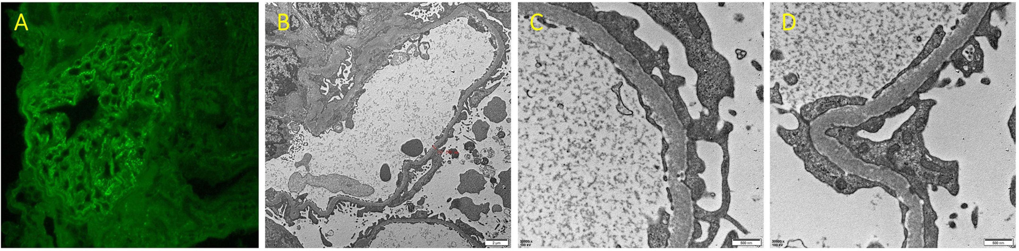 Figure 2. (A) Immunofluorescence staining for IgG of renal biopsy (×400). (B–D) Renal biopsy under electron microscopy (B ×6000; C,D ×30000).