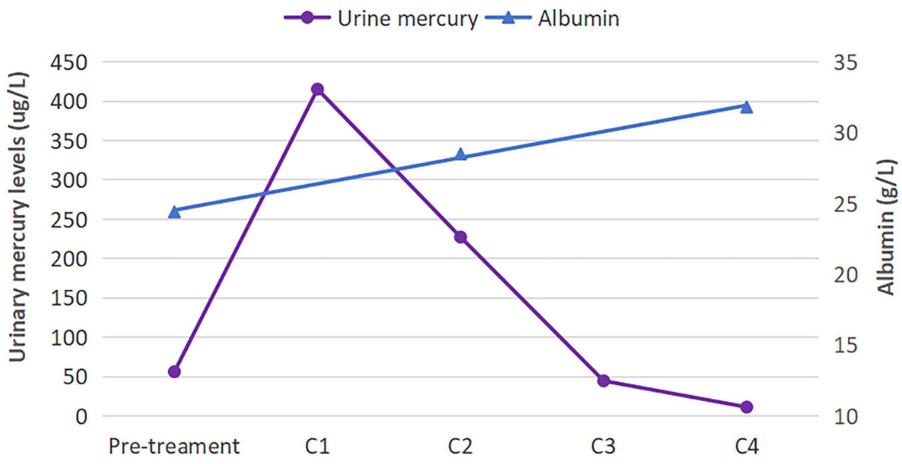 Figure 3. Urinary mercury and albumin levels before and after treatment. The urinary mercury level initially rose before rapidly declining, whereas the albumin level showed a steady rise. C, course of chelation therapy.