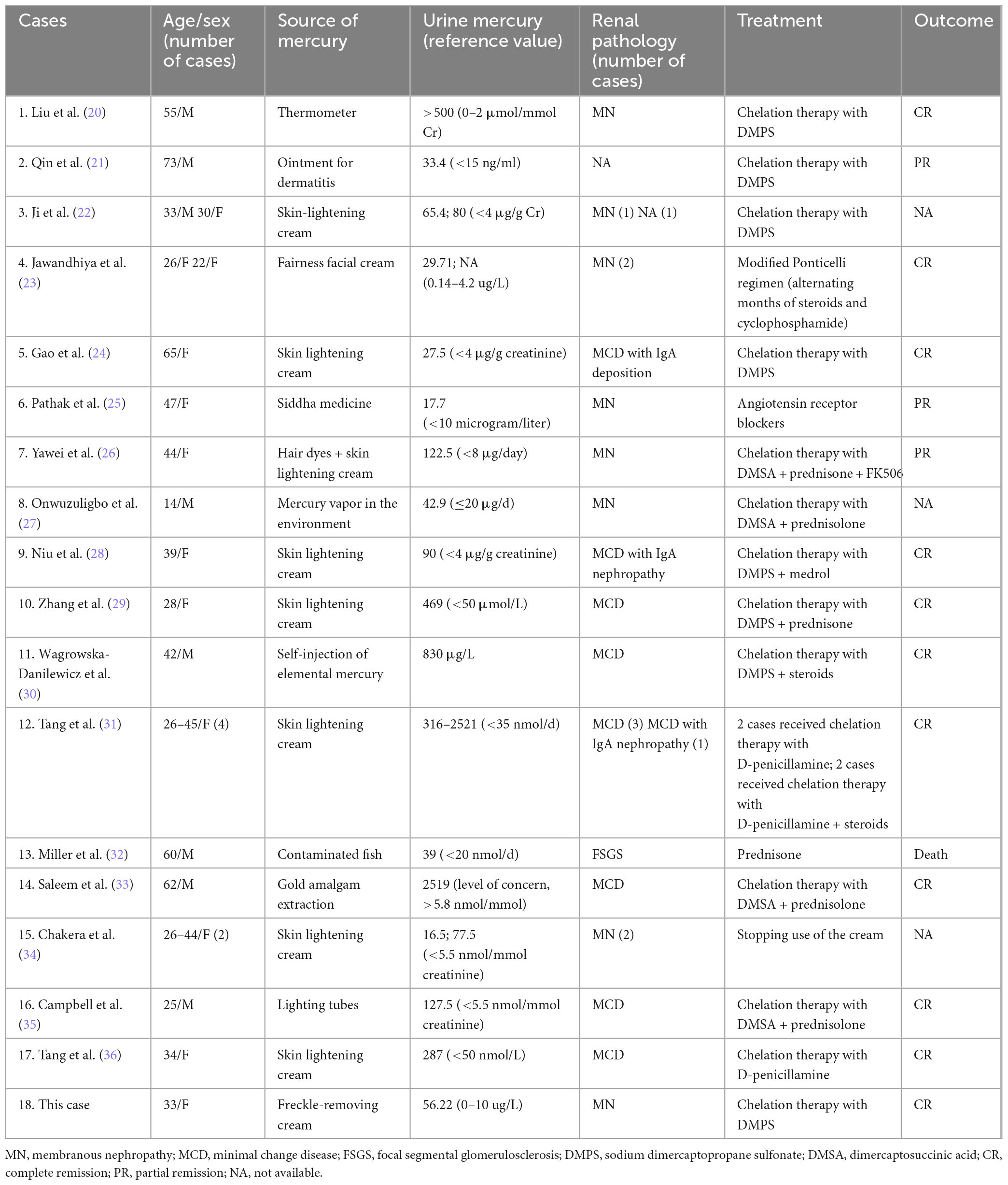 24. Gao H, Liu G, He Y, Chen J. Nephrotic syndrome of minimal change disease following exposure to mercury-containing skin lightening cream: a case report and literature review. Clin Nephrol. (2022) 98:107–12. doi: 10.5414/CN110751
