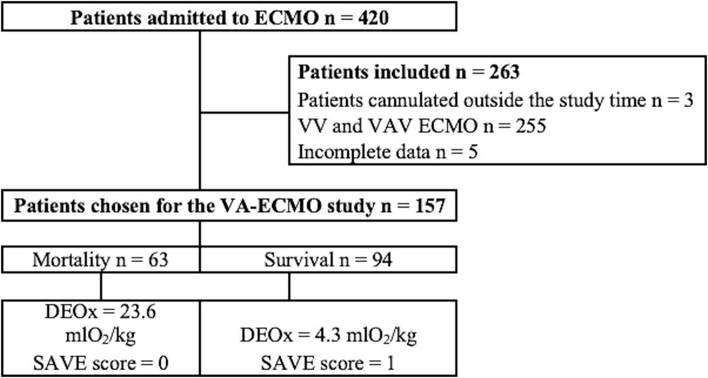 A total of 420 patients were admitted to the ICU for ECMO therapy during the study period, of which 263 patients did not meet the inclusion criteria, leaving 157 subjects for the final analysis, where 63/157 (40%) died, showing an average DEOx value of 11.4 mL O2/kg. Figure 1 illustrates the flow of subjects into the study.
