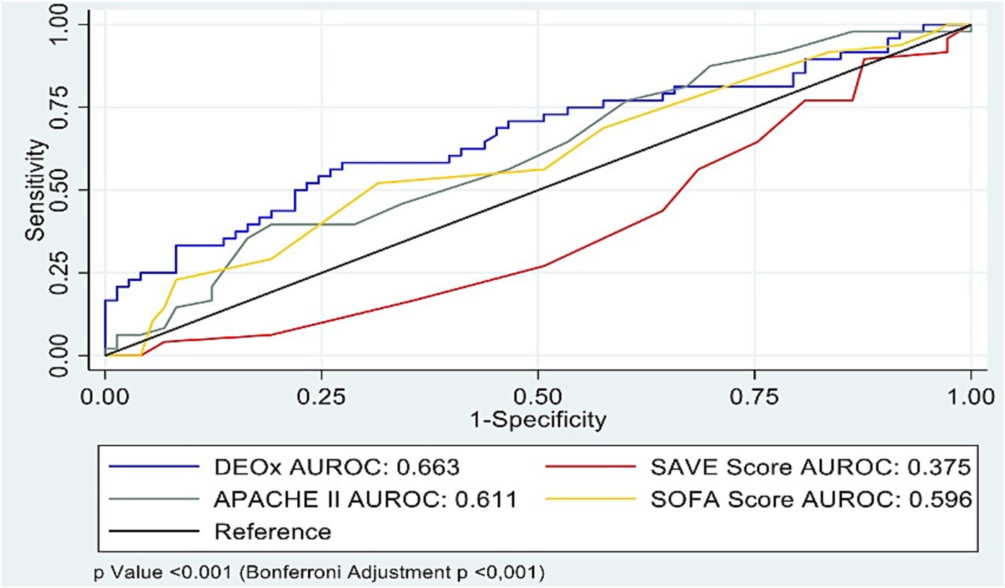 For 28-day mortality, the AUROC values were 0.663 for DEOx (95% CI 0.49–0.77), 0.611 for APACHE II (95% CI 0.51–0.71), 0.595 for SOFA (95% CI 0.49–0.69), and 0.625 for SAVE after reversing its orientation from survival to mortality calculated as 1-survival (untransformed AUROC for survival 0.375, 95% CI 0.27–0.47). Pairwise DeLong comparisons showed overall differences across curves (p < 0.001; Bonferroni-adjusted p < 0.001). AUROC estimates for all four tools are summarized in Table 1 and displayed in Figure 2.