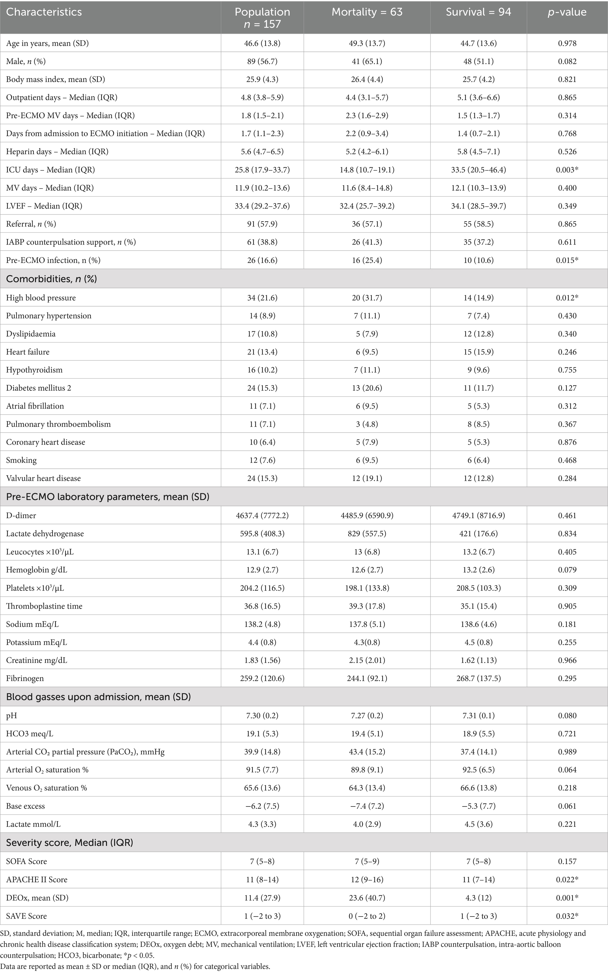 The mean age of the patients was 46.6 years (SD: 13.8), with 56.7% (89/157) being male. Time from admission to ECMO initiation: 1.7 days (IQR 1.1–2.3); duration of mechanical ventilation: 11.9 days (IQR 10.2–13.6) and left ventricle ejection fraction 33.4% (IQR: 29.2–37.6). The most prevalent comorbidities were arterial hypertension (21.6%), diabetes mellitus (15.3%) and valvulopathy (15.3%). A significant relationship was found between mortality and ICU length, infection before ECMO and hypertension. Table 2 summarizes the baseline characteristics of the population and their relationship with mortality. Unless otherwise specified, quantitative variables are presented as mean ± SD (normal distributions) or median (IQR) (skewed distributions).