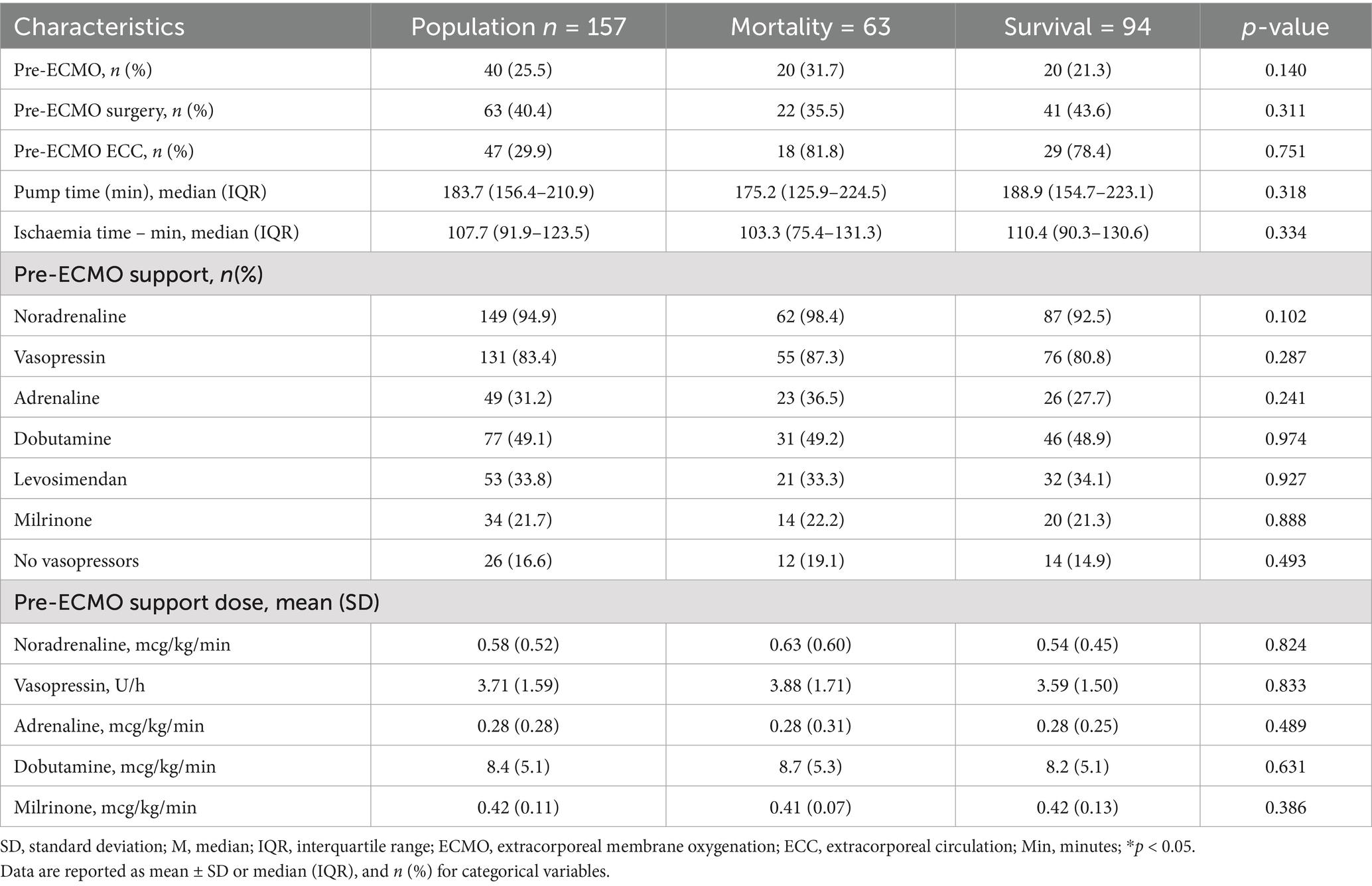 Regarding pre-cannulation cardiovascular conditions, no statistically significant differences were found between patients who survived and those who died. Although cardiac arrest before ECMO and cardiopulmonary bypass use before ECMO were slightly more frequent in non-survivors, these differences did not reach statistical significance. Similarly, the use of vasoactive/inotropic support was high, with no relevant differences between groups. Norepinephrine was the most frequently used drug (94.9%), followed by vasopressin (83.4%) and adrenaline (31.2%), with no significant differences in administered doses. Table 3 summarizes the pre-cannulation cardiovascular conditions, and the Supplementary Tables S1, S2 describes the causes of cardiogenic shock and those related to surgical events.