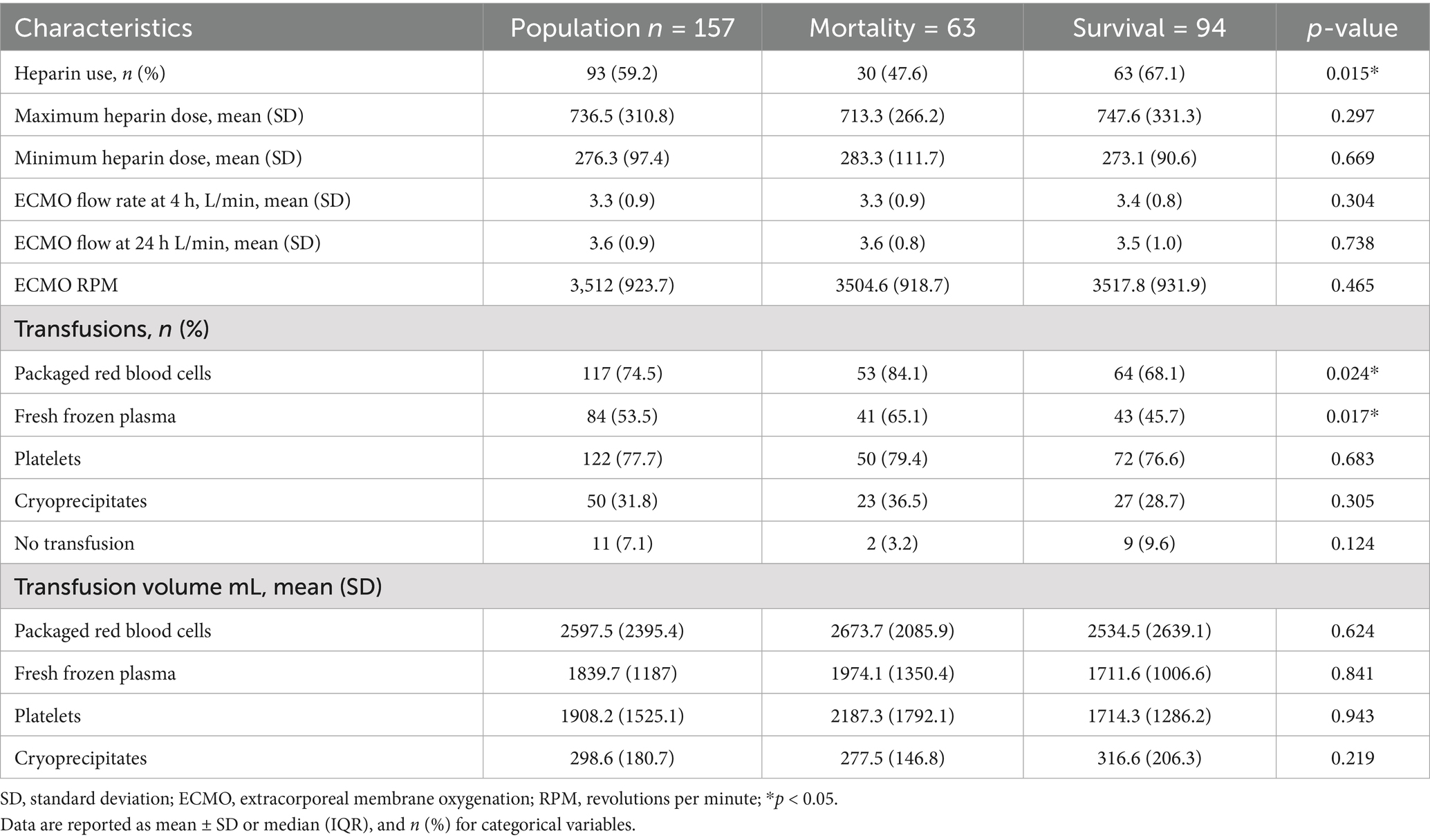 The ELSO® 2022 registry reported a higher incidence of thrombotic and hemorrhagic complications in VA-ECMO compared with VV-ECMO. The rate of circuit thrombosis was 0.225 per 1,000 h of support, whereas the rate of major thrombotic events, such as cerebral infarction, was 0.208/1,000 h. Hemorrhagic complications were more frequent (0.871/1,000 h), highlighting the need for anticoagulation with strict monitoring (43). Lv et al. (55) showed in a meta-analysis (7 studies, n = 553) that low-dose unfractionated heparin (aPTT 40–60 s) was associated with a significant reduction in bleeding—especially gastrointestinal (OR 0.36, 95% CI 0.20–0.64)—and surgical-site bleeding (OR 0.43, 95% CI 0.20–0.94), without increasing thrombotic complications, ECMO withdrawal, or mortality (OR 0.81, 95% CI 0.42–1.56). Garzón-Ruiz et al. (56) reported that targeting PTT < 60 s was protective, with a 30% reduction in bleeding for PTT 50–60 s, 22% for PTT 40–50 s, and 47% for PTT ≤ 40 s, without differences in thrombotic events. These observations are consistent with our data, which showed improved survival associated with heparin use.