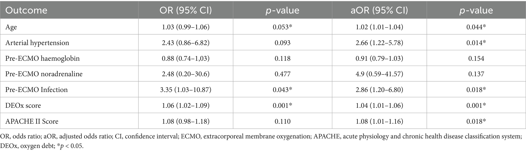 DEOx demonstrated a statistically significant association as an independent variable for 28-day mortality. The variables with the highest OR were infection before ECMO with an OR of 2.86 (95% CI: 1.20–6.80; p = 0.018), hypertension with an OR of 2.66 (95% CI: 1.22–5.78; p = 0.014), APACHE II score with an OR of 1.08 (95% CI: 1.01–1.16; p = 0.018) and DEOx with an OR of 1.04 (95% CI: 1.01–1.06, p = 0.001). In the multivariate analysis, the variables independently associated with the studied outcomes are presented in Tables 5, 6.