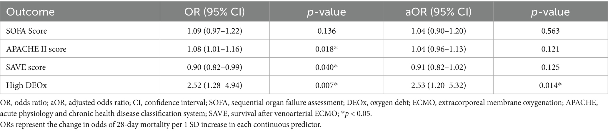 Table 5. Factors associated with 28-day mortality in VA-ECMO (multivariable logistic regression; predictors entered as standardized z-scores).