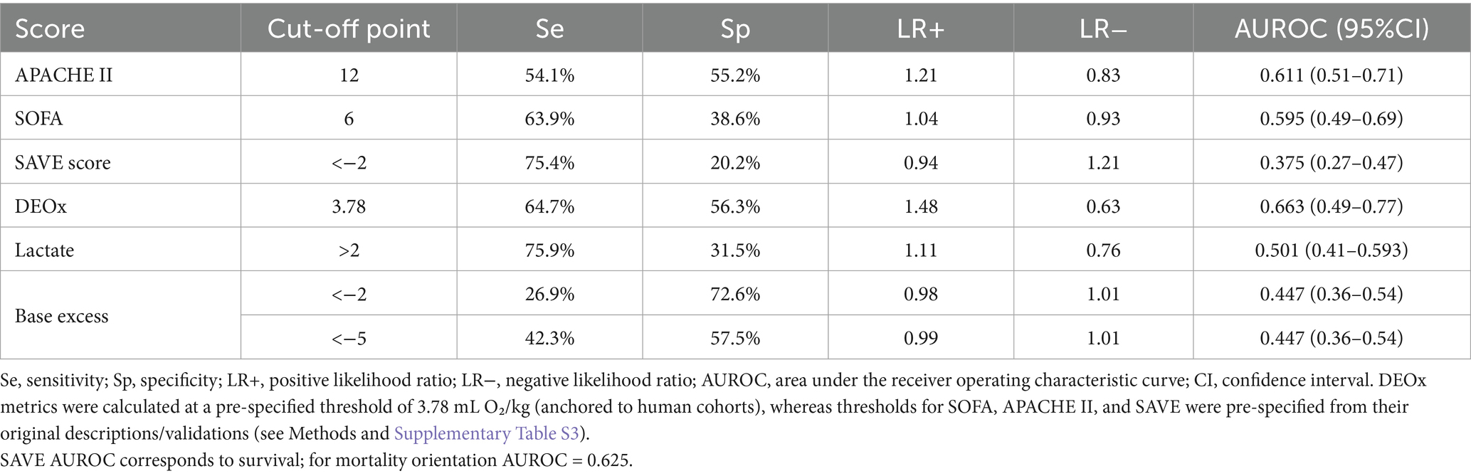 Using the scores obtained from APACHE II, SOFA, SAVE and DEOx corrected for different confounding variables, we calculated sensitivity, specificity, positive likelihood ratio (LR+) and negative likelihood ratio (LR−), along with the areas under the curve (AUCs) and 95% CIs, at the pre-specified thresholds as detailed in the methods (DEOx 3.78 mL O₂/kg anchored to human cohorts; SOFA, APACHE II, and SAVE per their original descriptions/validations). AUROCs were compared with the DeLong test (Bonferroni-adjusted). Analyses were performed in Stata 17.0 (StataCorp, College Station, TX, United States).