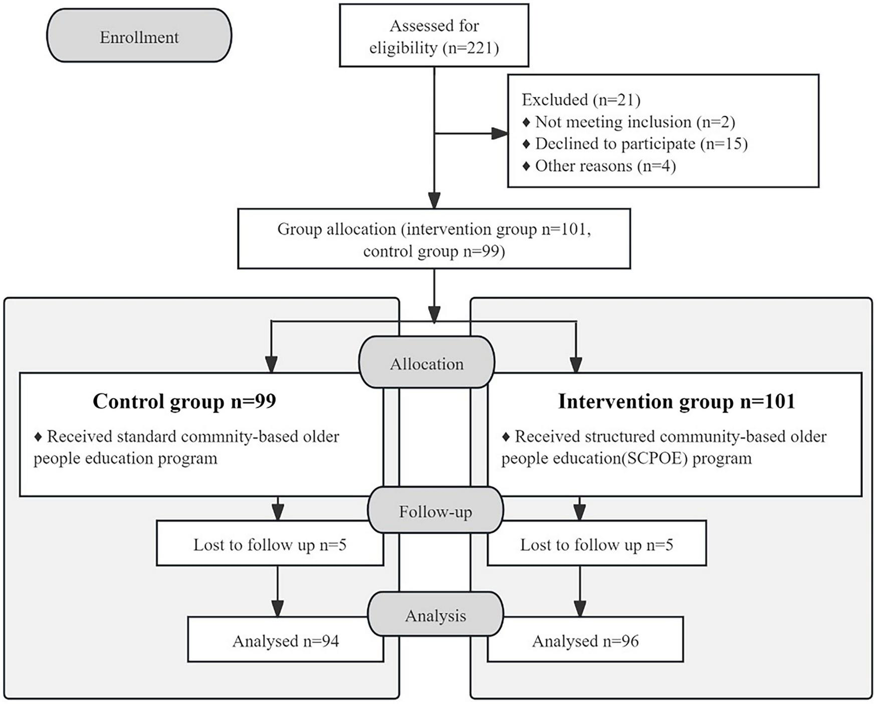 A consecutive sample of 221 third-year undergraduate nursing students enrolled in community nursing courses at a university in China was recruited between February and September 2023. Participants were divided into two groups based on their course enrolment: those taking Community Nursing A were assigned to the intervention group receiving the Structured Community-Based Older People Education Program (SCOPE), while those taking Community Nursing B formed the control group receiving the Standard Community-Based Older People Education Program. Eligibility screening was conducted according to predefined inclusion and exclusion criteria. Inclusion criteria were Enrolment in Semester 5–6 (year 3) of the Bachelor of Science in Nursing (BSN) program; completion of prerequisite courses: Fundamentals of Nursing I-II (Semesters 2–3); Health Assessment Practice (Semester 3); Medical/Surgical Nursing I (Semester 4); Active registration in Community Nursing A (intervention group) or B (control group); Provision of written informed consent. Exclusion criteria were: Documented mental health conditions or communication impairments affecting community practice; Academic suspension or withdrawal during the study period; and refusal to provide participation consent.