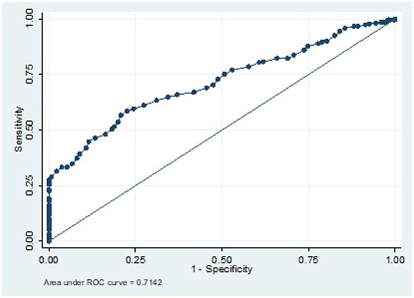 To predict the diagnosis of central hypertension during pregnancy, the ROC analysis results indicate that a cSBP of 116 mm Hg or higher has a sensitivity of 78.5% and a specificity of 50.3%. The cSBp values utilized as predictive variables for the ROC curve were derived exclusively from the HDP group. This model demonstrated a moderate discriminatory ability, with an area under the curve (AUC) of 0.7384 (Figures 2, 3).