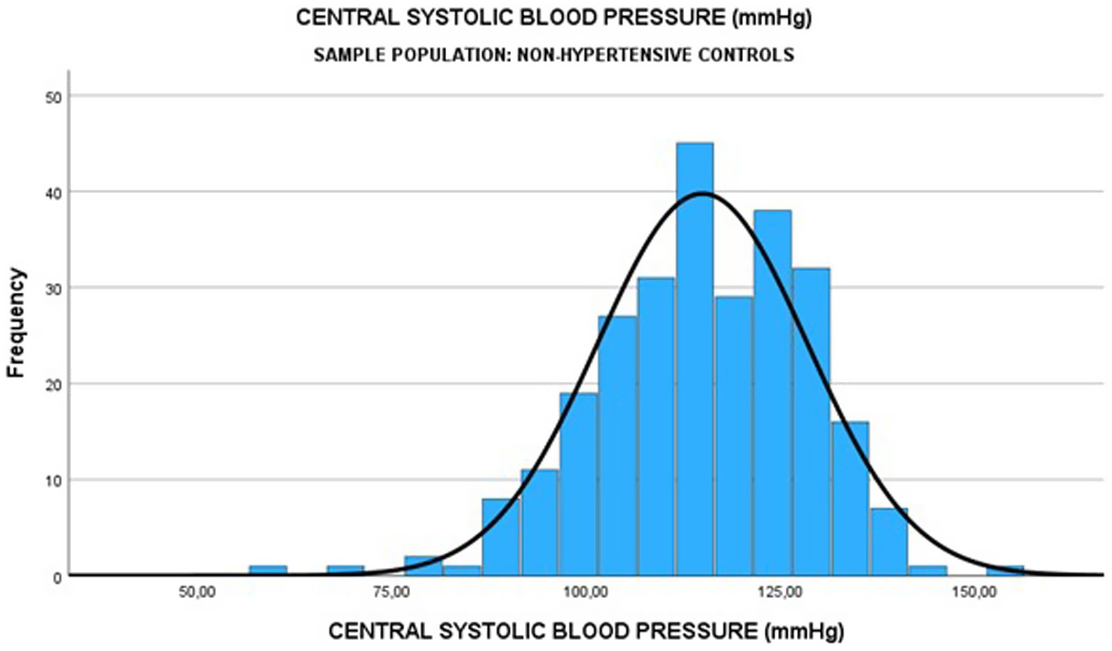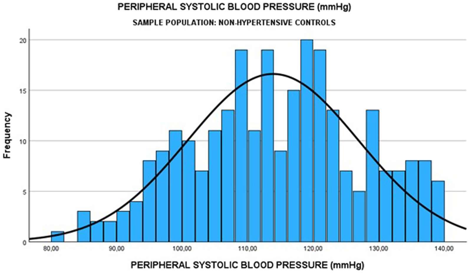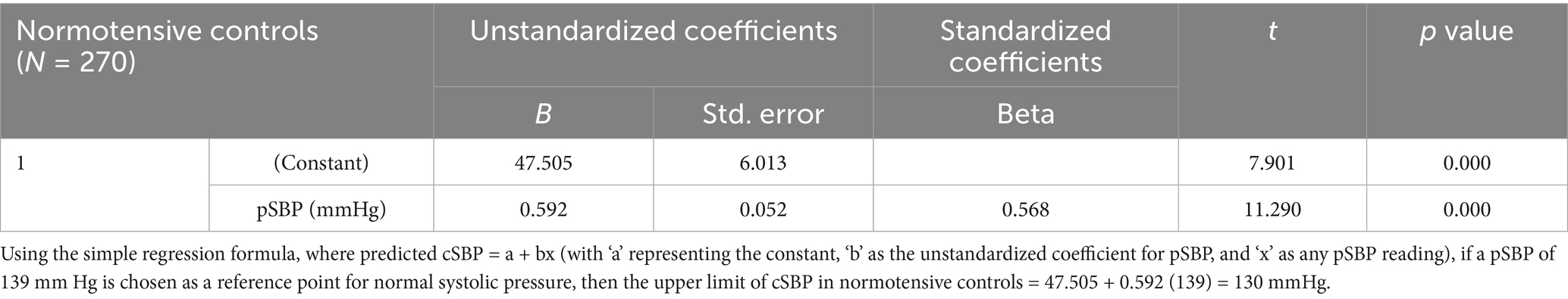 Based on a normal pSBP of <140 mmHg and a diastolic pressure of <90 mmHg, the upper limit of cSBP in normotensive controls was calculated to be 130 mmHg, while the upper limit of cDBP was calculated to be 78 mmHg (see Tables 4, 5) (23).