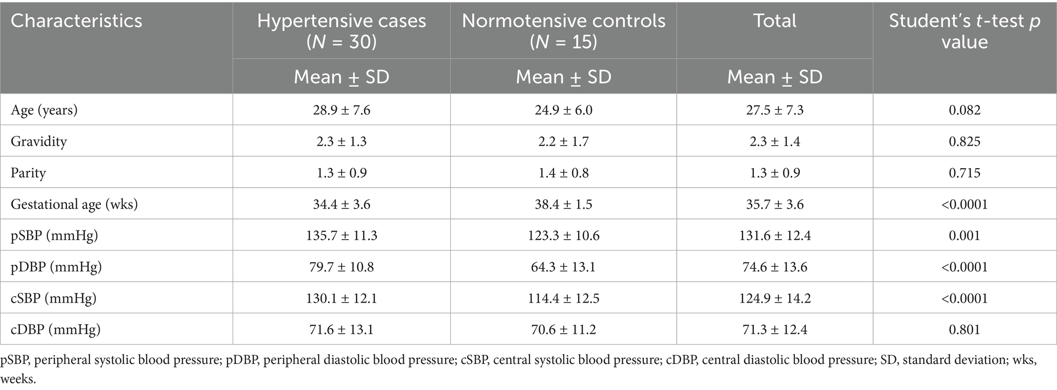The definitions of hypertension and HDP were based on the International Society for the Study of Hypertension in Pregnancy (23). Mild peripheral hypertension was defined as a pSBP of 110–159 mmHg and/or a pDBP of 90–109 mmHg. Severe peripheral hypertension was defined as a pSBP of 160 mmHg or higher and/or a pDBP of 110 mmHg or higher. The inclusion criteria for hypertensive patients were current hypertensive disease in pregnancy with a gestation period of ≥20 weeks. For controls, the inclusion criteria were a healthy normotensive singleton pregnancy in labor, those admitted for a repeat elective caesarean section at term, or women without hypertension presenting with particular conditions such as placenta previa, preterm premature rupture of membranes, or preterm labour. Participants were excluded if they were under 20 weeks pregnant or if they opted out of participation. Additionally, individuals with diabetes mellitus, cardiac disease, chronic renal disease, antiphospholipid syndrome, or other autoimmune diseases were also excluded from the study.