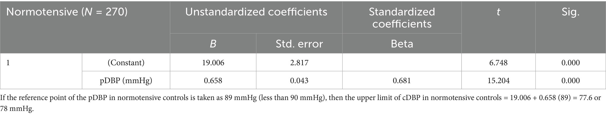 Among the 270 normotensive controls, median cDBP was 64.0 (IQR: 55.0–73.0) mmHg, and the median pDBP was 61.5 (IQR: 52.0–69.0) mmHg. There was a strong positive correlation between the two measurements (Spearman rank correlation of 0.669, p < 0.0001) as shown in Table 8. Linear regression analysis also revealed that there was a positive correlation between cDBP and pDBP, with changes in pDBP being significantly associated with a shift in the cDBP (B = 0.658; p < 0.0001). The difference between median pDBP and cDBP was 2.5 mmHg, which was statistically significant (Wilcoxon Signed Rank p < 0.0001).
