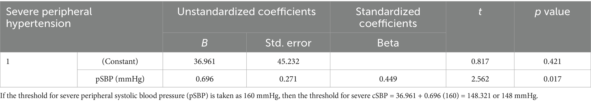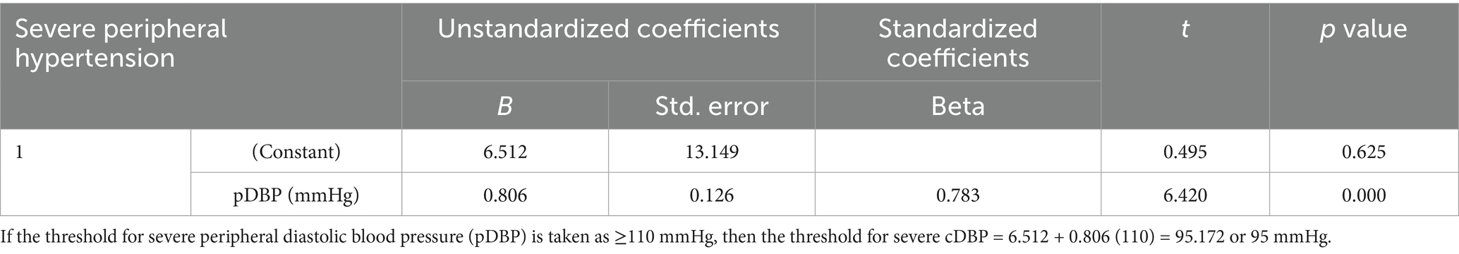 Linear regression equation was used to calculate the thresholds for severe central hypertension from the thresholds of severe PBP, defined as a pSBP of ≥160 mmHg, and/or pDBP of ≥110 mmHg, among women with HDP who were identified to have severe peripheral hypertension (23). The thresholds for severe central hypertension were found to be a cSBP of ≥148 mmHg and/or a cDBP of ≥95 mmHg (see Tables 6, 7).