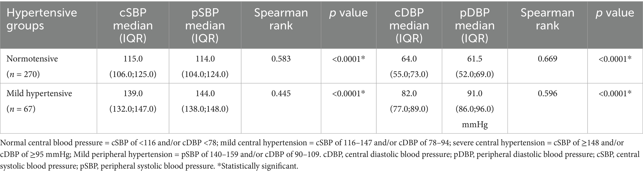 Furthermore, among the same group of women with mild peripheral hypertension, the median pDBP was 91.0 (86.0.96.0) mmHg, while the median cDBP was 82.0 (77.0–89.0) mmHg. There was a strong positive correlation between the two measurements (Spearman’s rank r = 0.596; p < 0.0001). Linear regression analysis revealed a strongly positive correlation between the pDBP and the cDBP and cDBP, and changes in pDBP were associated with a shift in the cDBP (B = 0.661; p < 0.0001). The difference between the median pDBP and cDBP was 9.0 mmHg, which was statistically significant (p < 0.0001).