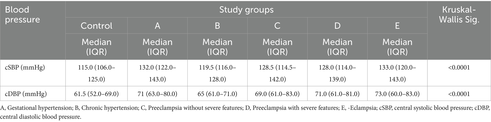 The role of brachial blood pressure in the prediction of future cardiovascular structural damage, morbidity, and mortality among non-pregnant adult population is well-established in high-income countries (1), as well as in middle-income countries, such as China and Mexico (2, 3). Controlling brachial blood pressure can reduce the risk of cardiovascular death (4). However, peripheral hypertension does not necessarily correlate with maternal and perinatal outcomes, except for the increased risk of intracranial hemorrhage when there is severe peripheral hypertension (5). Numerous studies suggest that CBP is superior to peripheral blood pressure (PBP) in predicting cardiovascular disease among non-pregnant patients (6–9). The superiority of CBP is likely due to central pressures exhibiting lower variability and more accurately reflecting the tension levels on major target organs such as the heart, brain, and kidneys (10). CBP is defined as blood pressure readings taken from the aorta or common carotid arteries, primarily influenced by increased arterial stiffness and wave reflection (11). It represents the pressure against which the heart must pump to ensure blood flow throughout the body. Evidence indicates that preeclampsia (PE) is associated with increased CBP, pulse wave velocity, and arterial stiffness (12–14). It is known that the cerebrovascular complications of PE and eclampsia can occur in the presence of mild elevations of PBP and even in the absence of proteinuria (15, 16). Since the blood flow to the brain is controlled by the central aortic blood pressure, it is possible that under conditions when there is only mild elevation of the brachial blood pressure, the CBP may be much higher, thus accounting for the vasogenic oedema typical of eclampsia, justifying the need to know how the CBP behaves in patients with HDP and eclampsia.