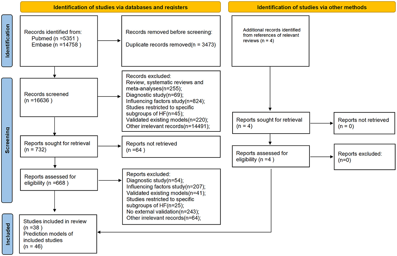 A total of 20,113 studies were initially identified. After removing 3,473 duplicates, 38 studies comprising 46 prediction models met the eligibility criteria following a review of titles, abstracts, and full-text articles (Figure 1). Notably, five of these studies reported on two or more prediction models. Among the included prediction models, 14 models from nine studies (9–17) were developed to predict outcomes in HFrEF patients, nine models from eight studies focused on HFpEF patients (18–25), and one model from a single study (26) targeted HFmrEF patients. The remaining 22 prediction models, derived from 20 studies (27–46), were designed for all HF patients regardless of subtype.
