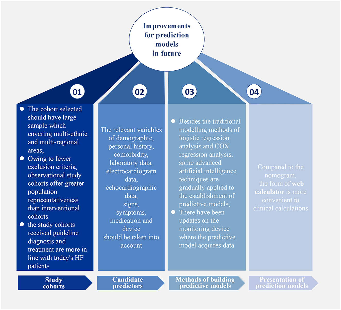 Among the predictive models for different HF subtypes, those for HFrEF have been the most extensively studied. However, due to limitations in research conditions at that time, early models did not include certain predictors now regarded as essential, which restricted their applicability in contemporary clinical practice. For HFpEF prediction models, a major issue is that the LVEF criteria used in early studies do not align with current guidelines, making it difficult to directly apply these models to today's patient populations. In contrast, research on HFmrEF prediction models is relatively scarce; only one externally validated model was included in this review, underscoring the need for further exploration in this area. Notably, no single model currently dominates in terms of predictive efficacy or clinical applicability. This may be attributed to several factors, such as incomplete selection of study cohorts, insufficient candidate predictors, and inconvenient presentation of prediction models (Figure 2).