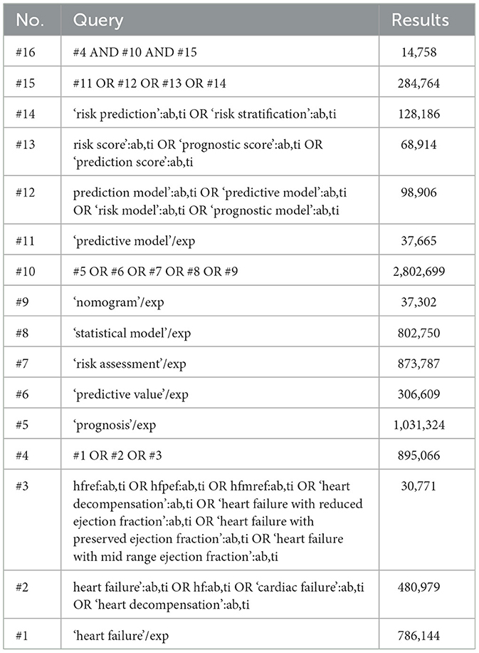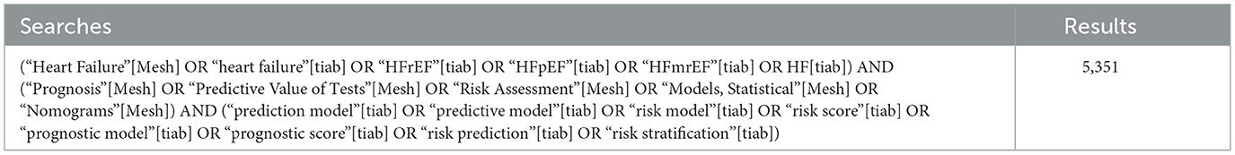 Studies on HF prediction models were systematically searched in PubMed and Embase from inception to September 19, 2025. Search terms included “heart failure,” “heart failure with preserved ejection fraction,” “heart failure with mildly reduced ejection fraction,” “heart failure with reduced ejection fraction,” “prognosis,” “prediction,” “risk score,” and their synonyms. The detailed search strategies were provided in Tables 1, 2. Additionally, the reference lists of relevant literature were screened to avoid omissions (7).