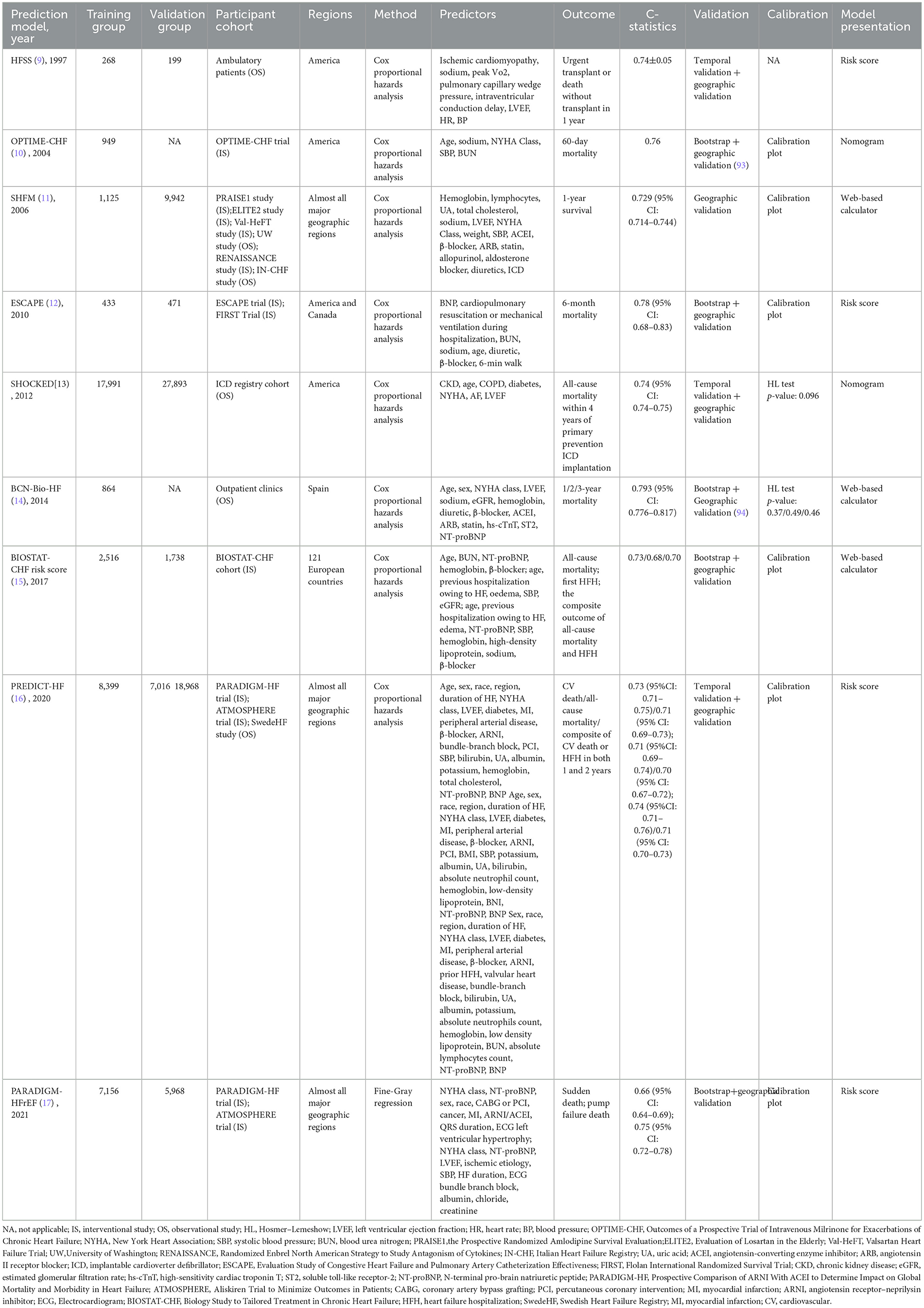 The Organized Program to Initiate Lifesaving Treatment in Hospitalized Patients with HF (OPTIMIZE-HF) (30), Redin-SCORE (39), the Development of Clinical Prediction Rules and Health Services Research in Patients with HF study (ESSIC-FEHF) (44), MODEL 3 (46) and HF patient severity index (HFPSI) (35) prediction models were employed to forecast all-cause mortality or HFH over periods ranging from 1 to 6 months. The OPTIMIZE-HF prediction model (30) was developed to predict mortality within 60–90 days post-discharge, while the ESSIC-FEHF prediction model (44) was employed to forecast mortality within 2 months; however, neither of these models incorporated BNP. Both Redin-SCORE and HFPSI prediction models were developed using outpatient cohorts: Redin-SCORE (39) predicted 1-month mortality, while the HFPSI prediction model (35) forecasts 6-month all-cause mortality or HFH. MODEL 3 (46) was a predictive model developed using LASSO regression on EHR data to forecast 90-day mortality in elderly HF patients. This model could be directly implemented in the hospital information system for intelligent prediction of HF patients. All three models incorporated BNP but required further external validation in other countries and regions. Additionally, the EFFECT-HF and Redin-SCORE prediction models could predict 1-year all-cause mortality.