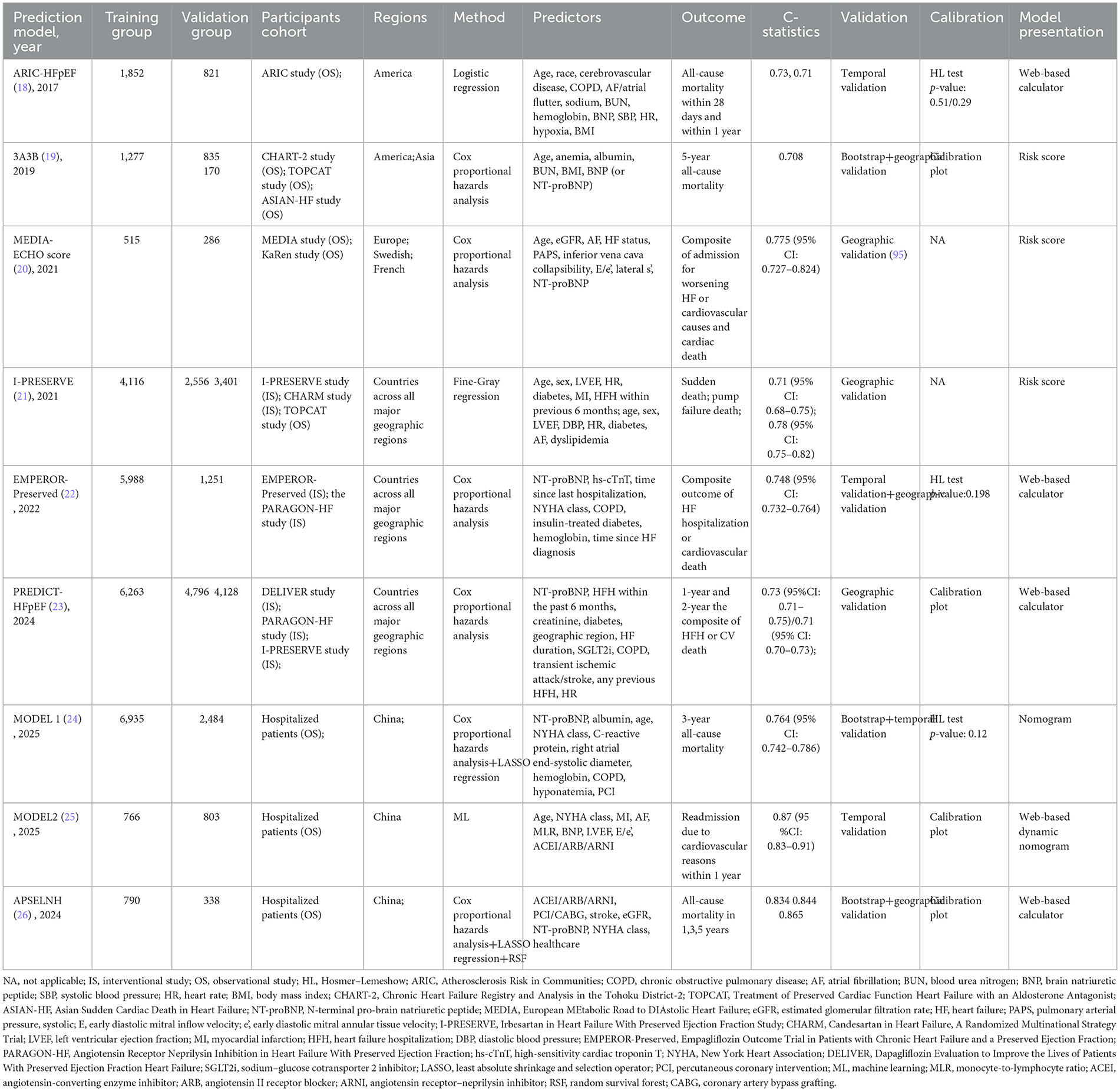As shown in Table 4, Atherosclerosis Risk in Communities (ARIC-HFpEF) (18), MODEL 1 (24), and the 3A3B risk score (19) were three prediction models that could be used to predict all-cause mortality in patients with HFpEF. Among them, the ARIC-HFpEF prediction model (18) was capable of predicting both short- (28-day) and long-term (1-year) mortality risk. Notably, it was the first prediction model specifically developed for patients with acute decompensated HFpEF (LVEF ≥50%), who typically presented with poorer prognoses. During its development, the model innovatively incorporated variables related to signs/symptoms, such as shortness of breath, edema, and hypoxia, with hypoxia ultimately being established as a formal predictor. Additionally, the model was presented as a web-based calculator, greatly facilitating its clinical application. MODEL 1 (24) was used to predict 3-year mortality in HFpEF patients (LVEF ≥50%) and included a series of novel predictors related to inflammation and nutritional status, though it did not incorporate treatment-related variables. The 3A3B risk score (19) aimed to predict 5-year mortality risk in HFpEF patients (LVEF ≥50%). Constructed based on an observational cohort with few exclusions, this model demonstrated good applicability. However, all three models were developed using cohorts from single regions, and their generalizability required further external validation in other populations. Similar to the PARADIGM-HFrEF prediction model, the Irbesartan in HF with Preserved Ejection Fraction Study (I-PRESERVE) prediction model was employed to predict sudden death and pump failure in patients with HFpEF (LVEF >40%, LVEF ≥45%). However, this model did not incorporate BNP as a predictor and also exhibited shortcomings in calibration.