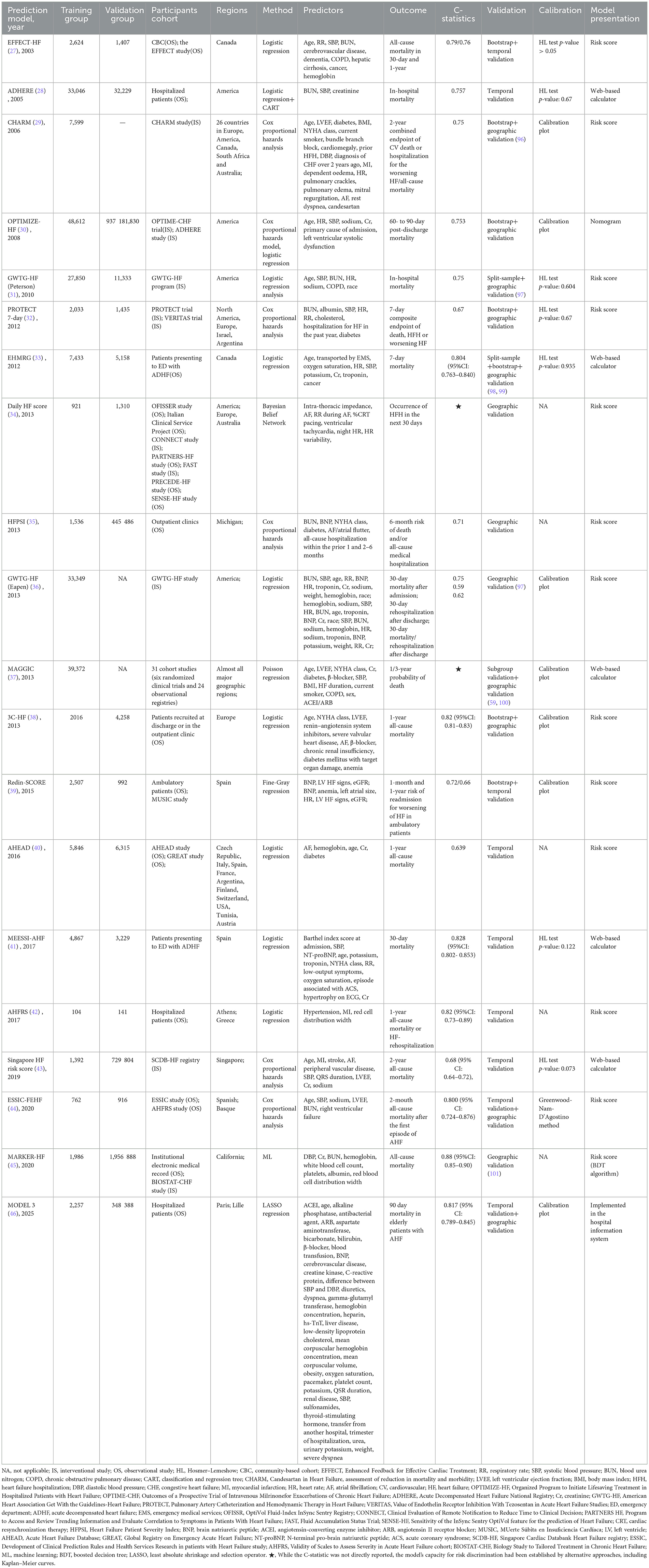 Moreover, the presentation of the model is equally important. Most models are presented in the form of computational formulas or nomograms, but the web calculator format is more conducive to clinical calculations, facilitating the wider dissemination of models. The bold models in the table are all in the form of web calculators. With advances in technology, predictive models using ML for EHR data have been gradually developed. These models could be implemented in the hospital information systems to intelligently identify the prognosis of in-hospital HF patients (46).