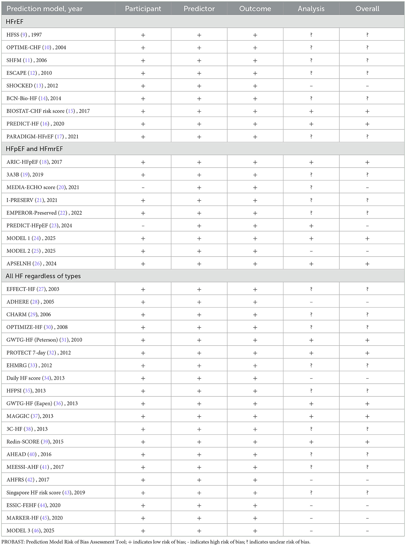 Results: A total of 46 prediction models from 38 studies were included. According to target population classification, 14 models were developed for predicting outcomes in HF patients with reduced ejection fraction, nine models were applicable to HF patients with preserved ejection fraction, one model targeted HF patients with mildly reduced ejection fraction, and the remaining 22 were designed for all HF patients regardless of subtype. The risk of bias assessment showed that 10 models had a high risk of bias, 21 models demonstrated an unclear risk of bias, and 15 models exhibited a low risk of bias. The study systematically summarized each model's study cohort, modeling methodology, predictors, outcomes, prediction performance, presentation format, as well as strengths and limitations.