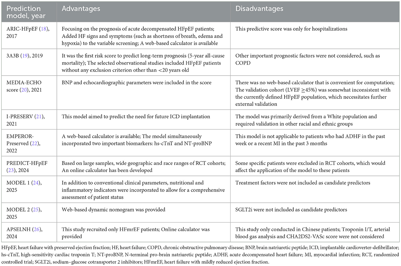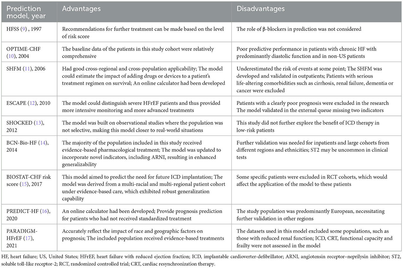 Due to the heterogeneity of HF, researchers have developed different prediction models for different types of HF. Prediction models for HFrEF and all HF types are more mature, while the number of studies on HFpEF and HFmrEF are fewer due to the newer concepts and definitions, although related studies are gradually growing (61). This study comprehensively summarizes the characteristics and shortcomings of each prediction model and visually presents them in the form of tables (Tables 7–9). Among them, the prediction models in bold are considered to have better predictive performance than the others.