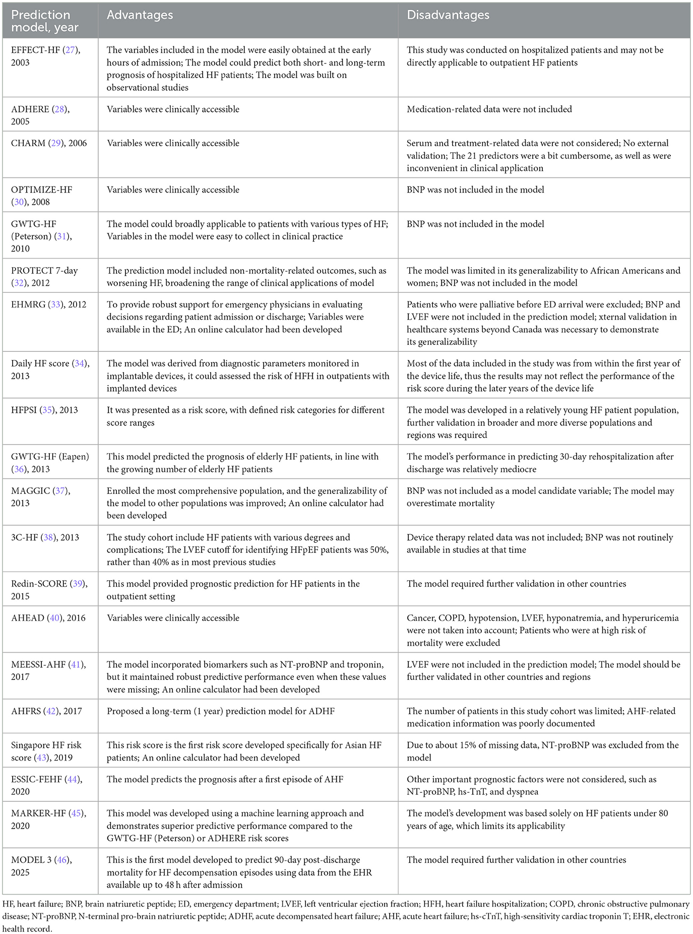 In addition to the prediction models mentioned above, several prediction models were specifically designed for patients with acute decompensated HF (ADHF). The Emergency HF Mortality Risk Grade (EHMRG) (33) and the Multiple Estimation of Risk based on the Emergency Department Spanish Score In Patients with AHF (MESSI-AHF) risk score (41) were models that could be rapidly applied in the emergency department (ED) to assist in determining whether an ADHF patient required hospitalization. The EHMRG prediction model (33) primarily predicted 7-day mortality, while the MESSI-AHF risk score (41) predicted 30-day mortality. In terms of predictor selection, both models utilized clinical variables readily available in the ED. The MESSI-AHF risk score incorporated NT-proBNP and troponin as predictors. Validation results demonstrated that even without NT-proBNP, these two models could maintain retain a certain level of predictive performance; however, the inclusion of NT-proBNP further enhanced their predictive accuracy. Considering the comprehensiveness of predictors, the rigor of validation methodologies, and the representativeness of study populations, MESSI-AHF demonstrated superior predictive performance and greater potential for clinical applicability.