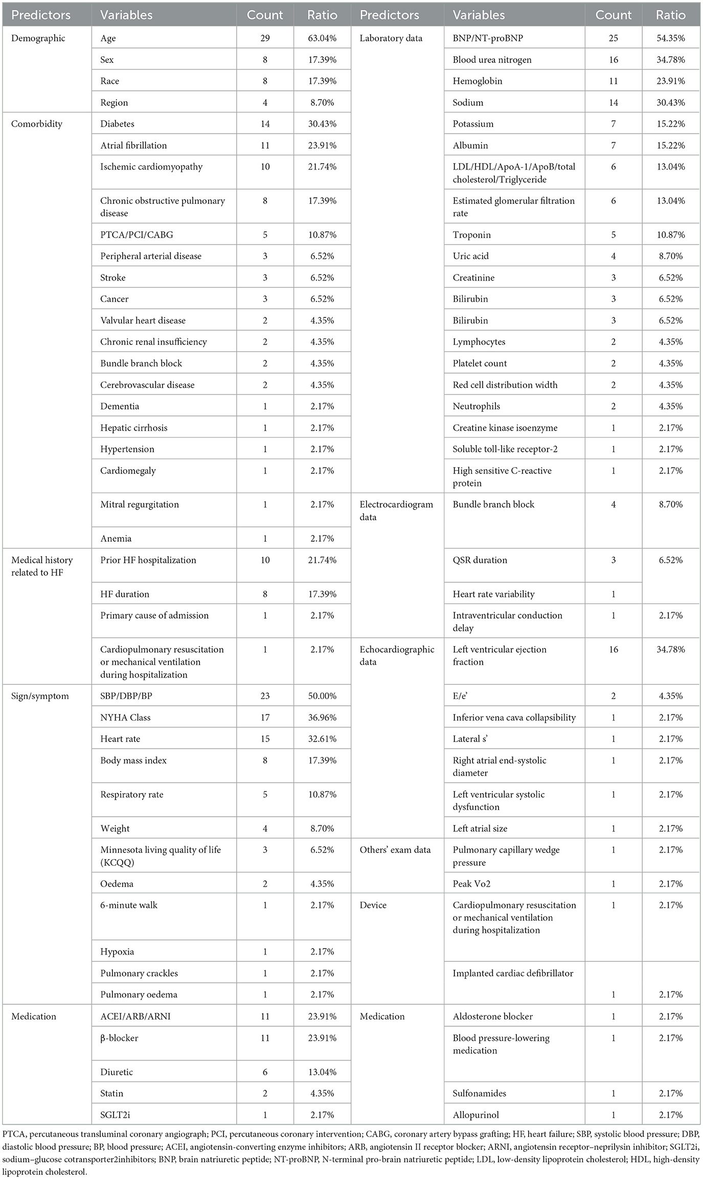 The study cohort was both source of research data and the basis for model construction, making the selection an appropriate study cohort crucial. Most of the study cohorts used in developing prediction models were small to medium-sized single-center cohorts. As these cohorts covered insufficient populations, representative predictors, such as race, region, and gender, could not be screened out. Prediction models established in this way also needed to be externally verified by multi-center studies and larger cohorts. In contrast, widely used prediction models, such as MAGGIC-HF and SHFM-HFrEF, selected large sample cohorts that included multi-ethnic and multi-regional areas to ensure their universal applicability to a broader patient population. Additionally, prediction models based on observational study cohorts are applicable to a wider range of populations than those based on intervention studies. Interventional studies inevitably excluded patients with a high mortality risk, such as those with hypoalbuminemia or cancer, or those with a recent history of myocardial infarction or HFH within the past 3 months. This not only limited the application of prediction models in these populations but also introduces bias into the models. While observational studies have fewer exclusion criteria and can include patients more comprehensively, the larger the number of intervention studies in the real world has led most of prediction models to rely on intervention studies as their modeling cohorts, thus limiting their applicability. Finally, study cohorts that have received guideline-recommended diagnostics and treatments are more suitable as target populations for developing prediction models. In recent years, significant progress has been made in the diagnosis and treatment of HF, and guideline recommendations for clinical practice have been established. Although earlier prediction models helped predict the prognosis of HF patients, biomarkers such as BNP/NT-proBNP and echocardiography-related indices were not regarded as important for HF diagnosis at that time, nor were β-blockers, ACEI, ARB, ARNI, and SGLT2i used as routine treatments. Subsequent studies have proven the predictive incremental effect of BNP/NT-proBNP on early prediction models (48, 59), indicating that the applicability of earlier prediction models in contemporary HF patients receiving guideline-based therapy remains limited. In contrast, the PREDICT-HFpEF and APSELNH-HFmrEF prediction models created in recent years, selected study populations that received standardized evidence-based treatment, and the final models included the novel diagnostic and therapeutic indices mentioned above, confirming the important role of these indices in HF prognosis.