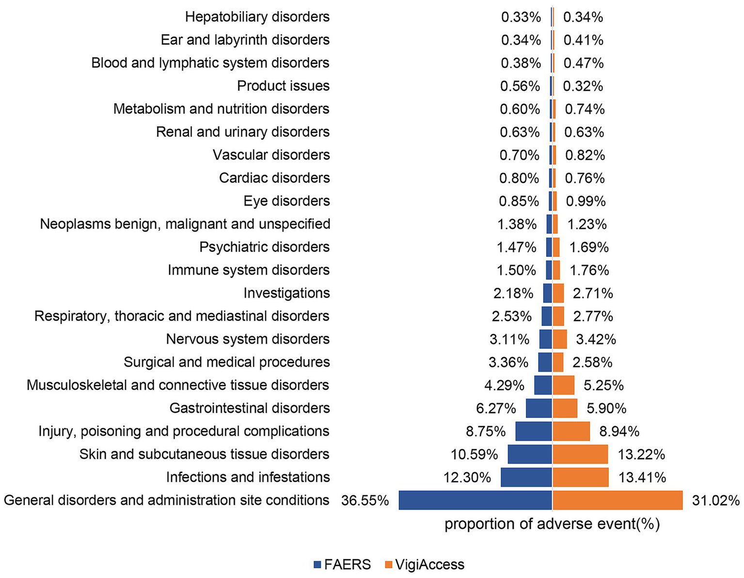 Figure 2. Proportions of AEs by system organ class for ixekizumab based on data from FAERS and VigiAccess.