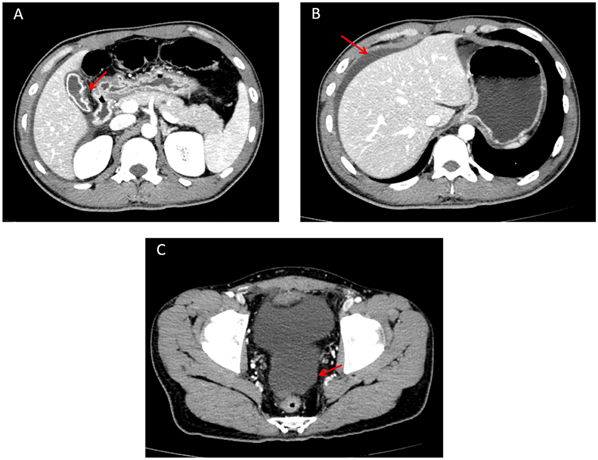Figure 1. Abdominal contrast-enhanced CT image. (A) Perforated gallbladder (showing interrupted continuity and indistinct margins of the gallbladder wall adjacent to the duodenum) on abdominal computed tomography. (B) Perihepatic fluid collection, with the liver demonstrating a smooth outer margin, normal morphology, size, and hepatic lobe proportions, on abdominal computed tomography. (C) Pelvic fluid collection on abdominal computed tomography.