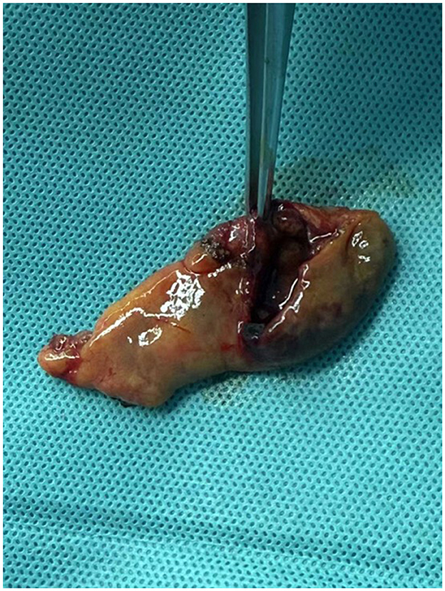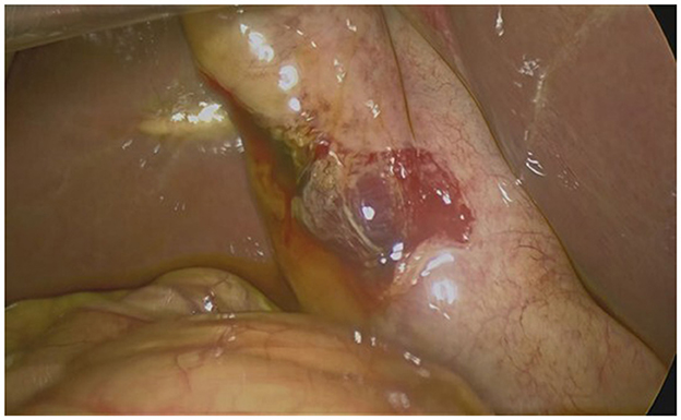 During laparoscopic exploration, approximately 300 ml of bile was found in the abdominal cavity. The gallbladder was atrophic (5 cm × 4 cm; Figure 2), with a 2 cm rupture site showing necrotic tissue and congestion at the edge (Figure 3). A small area of liver contusion was noted near the gallbladder bed, while the diaphragmatic surface of the liver was smooth. Exploration of the stomach, duodenum, jejunum, ileum, colon, rectum, pancreas, and kidneys revealed no abnormalities. Thus, laparoscopic cholecystectomy for gallbladder perforation was performed under general anesthesia, with successful outcomes.