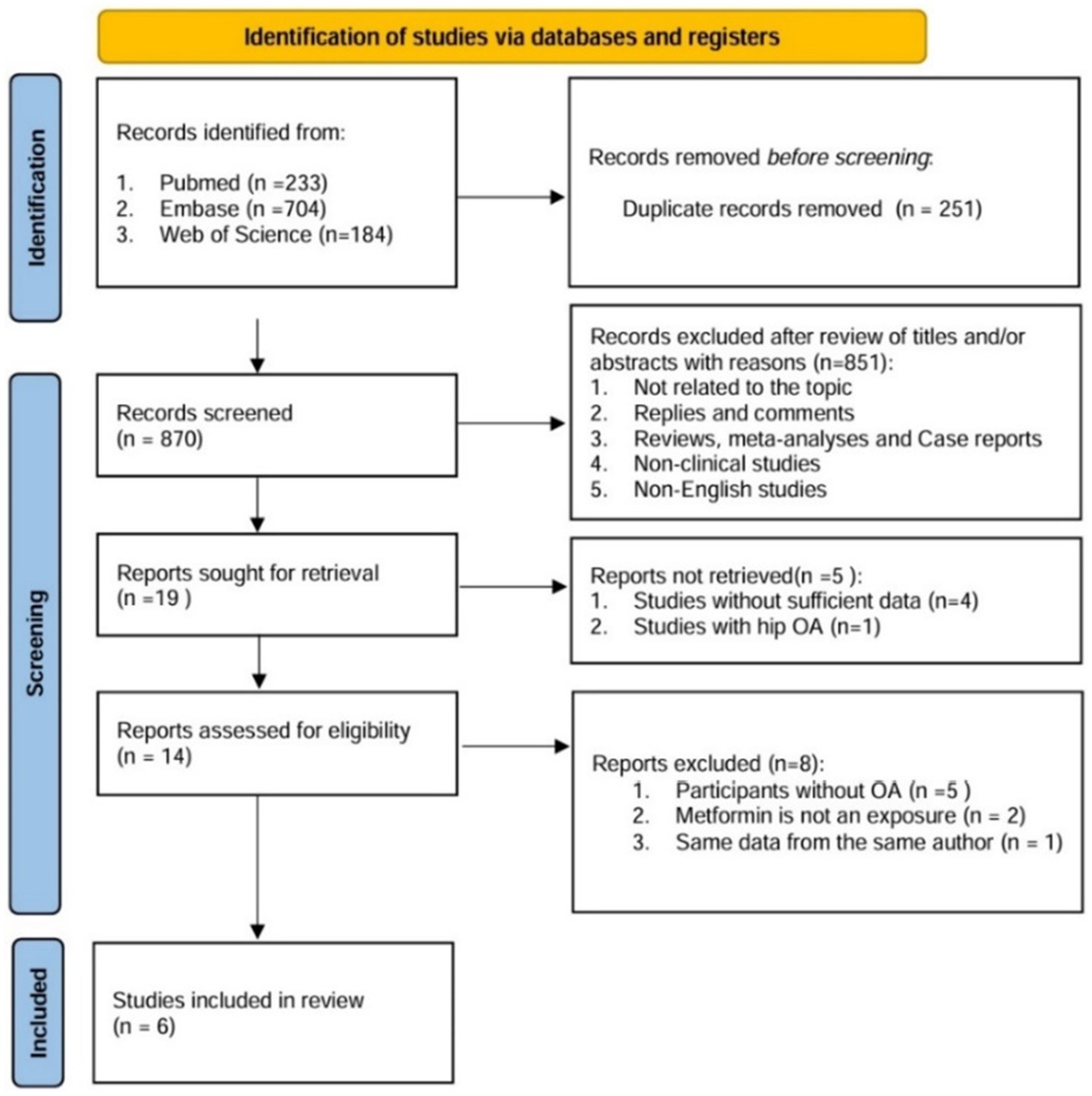 The inclusion criteria that should be met are: (1) The study type is a randomized controlled trial, a cohort study, or a case–control trial; (2) The research subjects were adult patients with KOA, regardless of whether they were complicated with metabolic syndrome (such as diabetes, etc.); (3) The research content is the effects of metformin use and non-use on KOA patients; (4) At least one outcome measure should be included (knee Pain Scale, number of joint replacement surgeries, WOMAC Scale, KOOS scale, Knee Function Scale, etc.). Exclusion criteria: (1) Non-human studies, reviews, letters, case reports, laboratory articles, and conference abstracts; (2) No reliable data; (3) Non-English articles. The included studies were independently discovered and evaluated by two researchers. Any differences between the two investigators were resolved by consensus.