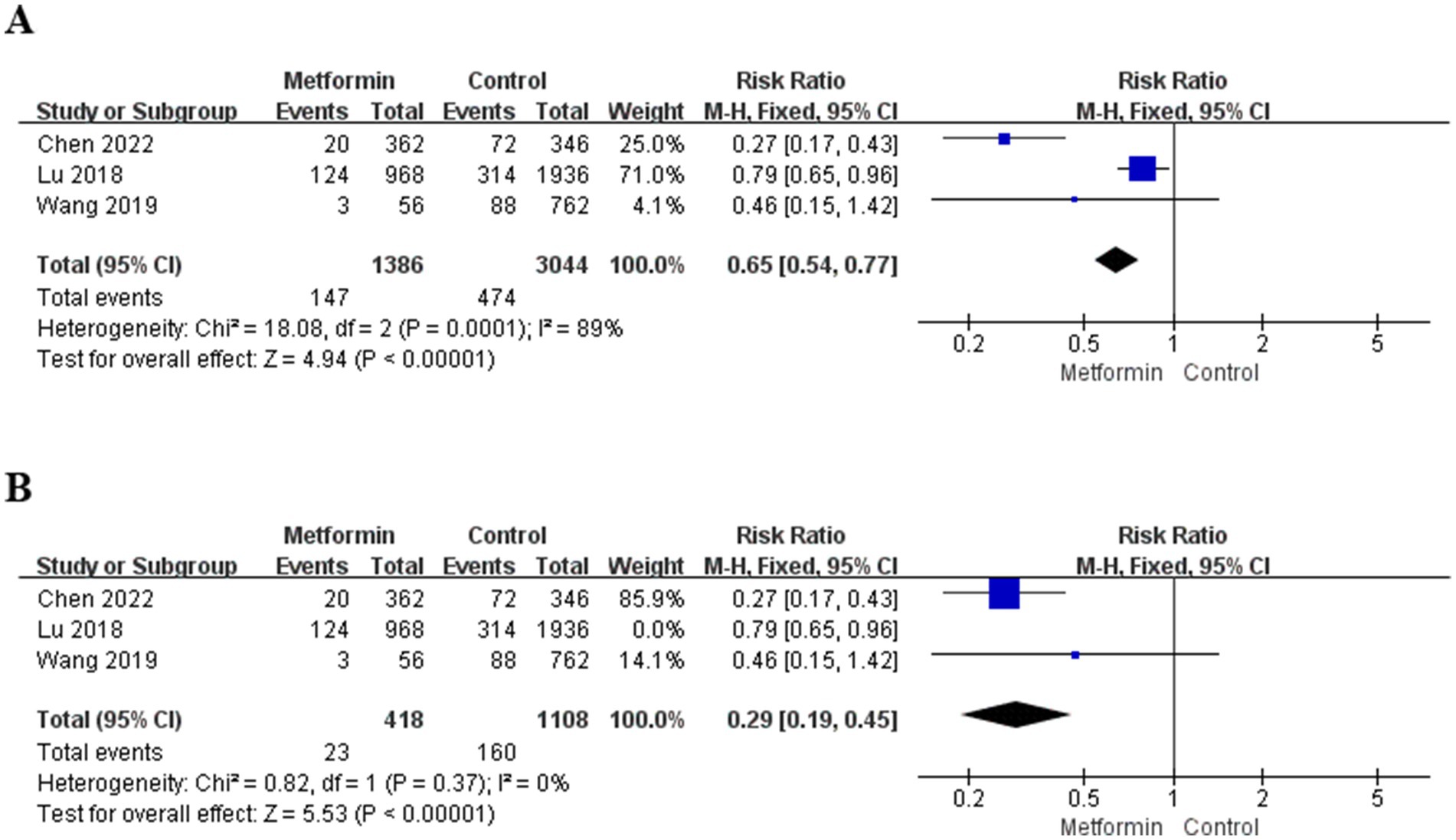 A total of three studies were included in the analysis, involving 4,430 patients (1,386 patients used metformin and 3,044 patients non-use). The risk ratio (RR) and 95% confidence interval were calculated using the fixed-effect model. The aggregated results suggested that the risk of TKA after metformin treatment was significantly reduced (RR = 0.65; 95% CI: 0.54, 0.77; p < 0.00001), and the specific situation is shown in Figure 3A. However, the heterogeneity in the study was significant (I2 = 89%). Therefore, the three studies were analyzed, respectively. When the study of Lu et al. (15) was not included, the heterogeneity decreased to zero, and the results were also statistically significant, as shown in Figure 3B.