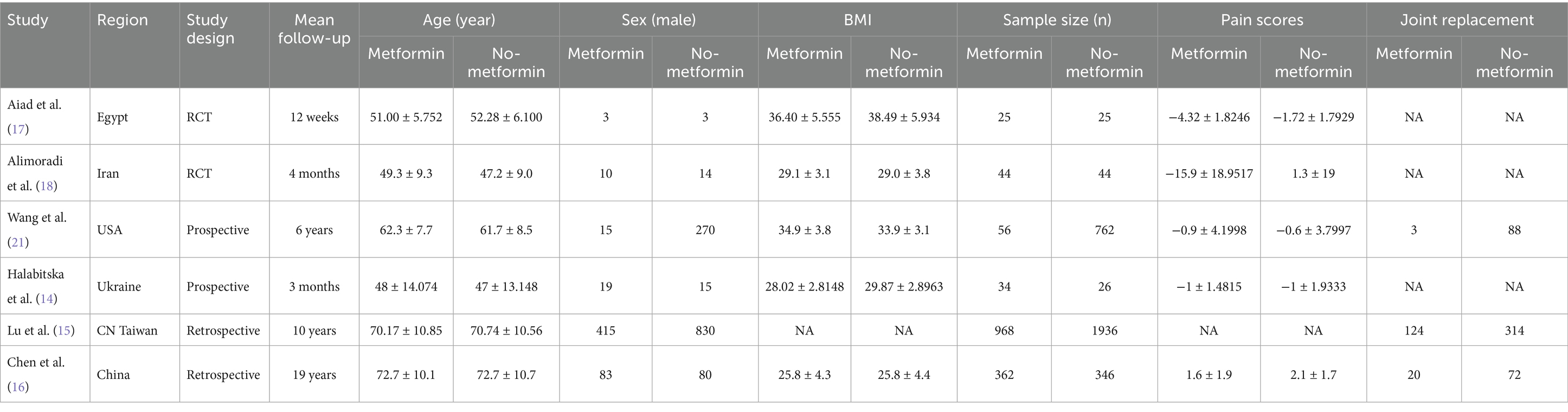 A systematic review published in 2022 expounded on the efficacy of metformin in the treatment of OA in preclinical and human studies. This review did not conduct a meta-analysis and was different from our search strategy (7). Moreover, there were three updated studies after 2022. Therefore, we combined the latest experimental studies and pool-up analyses. Systematically evaluate the efficacy of metformin in patients with KOA.