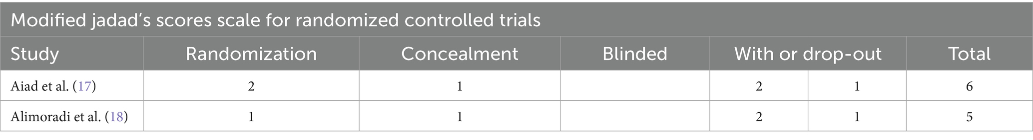 Two RCTS were evaluated using the Jadad scale, the modified Jadad score range for qualified studies is from 4 to 7, and both scores were within the range, the detailed scoring criteria are presented in Table 2. The remaining four articles were evaluated using the NOS scale. Studies with a score of 7–9 were considered of high quality. Two literatures are regarded as high-quality studies. It is presented in Table 3.