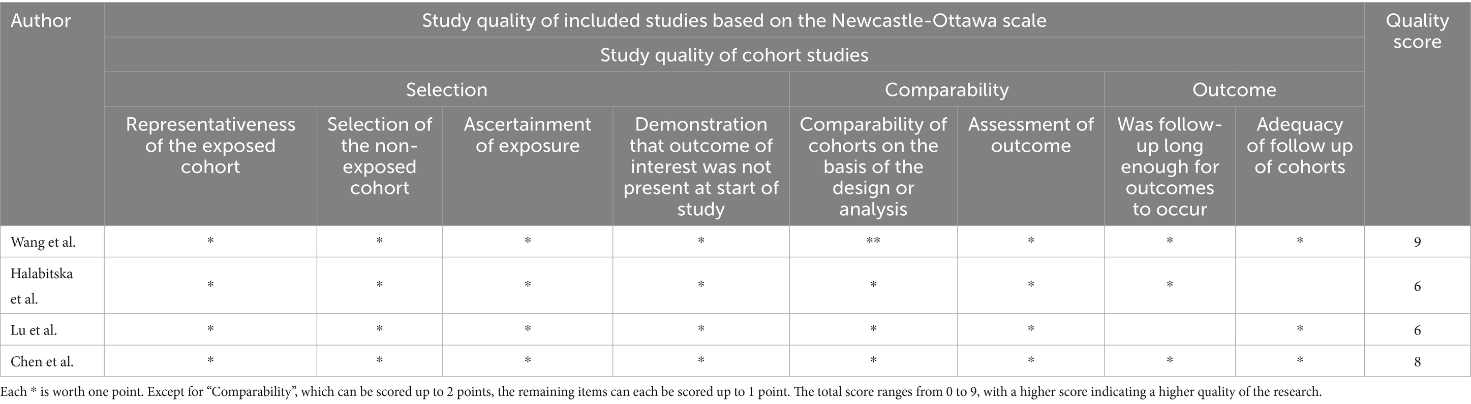 We used the Newcastle—Ottawa Scale (NOS) (11) to assess the quality of cohort studies and case–control studies. The score range was 0–9 points, and a score of 0–3 points indicated a lower quality of the articles, 4–6 indicates average article quality, while a score of 7–9 indicates relatively high quality. For randomized controlled trials, we used the modified Jadad scale (12) to assess the risk of bias. A score of 1–3 was considered low quality, and a score of 4–7 was considered high quality.
