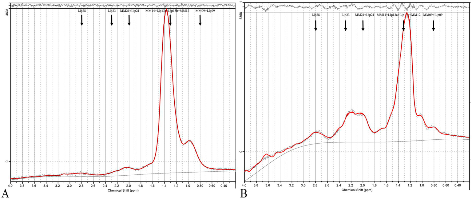 Proton magnetic resonance spectroscopy (1H-MRS) is a non-invasive technique that detects metabolic changes in living tissues, allowing for the quantification of metabolite concentrations and biochemical alterations (10). Recent studies using ex vivo MRS and metabolomics have provided critical insights into amino acid and lipid dysregulation in the serum of PCOS patients (11). Therefore, it is possible to investigate the clinical usefulness of MRS for lipid metabolism in PCOS patients.