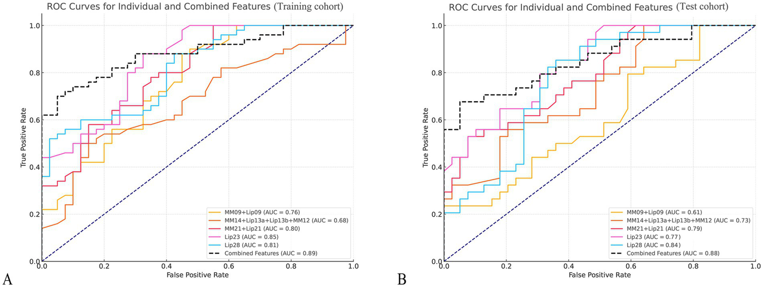 The combination model of key lipids reached an AUC of 0.89, with a 95% confidence interval (CI) of 0.83–0.95, and sensitivity, specificity, positive predictive value (PPV), and negative predictive value (NPV) of 0.76, 0.95, 0.95, and 0.76, respectively, in the training cohort; and of 0.88 (95% CI, 0.80–0.95), 0.76, 0.87, 0.84, and 0.81, respectively, in the test cohort (Figure 4).