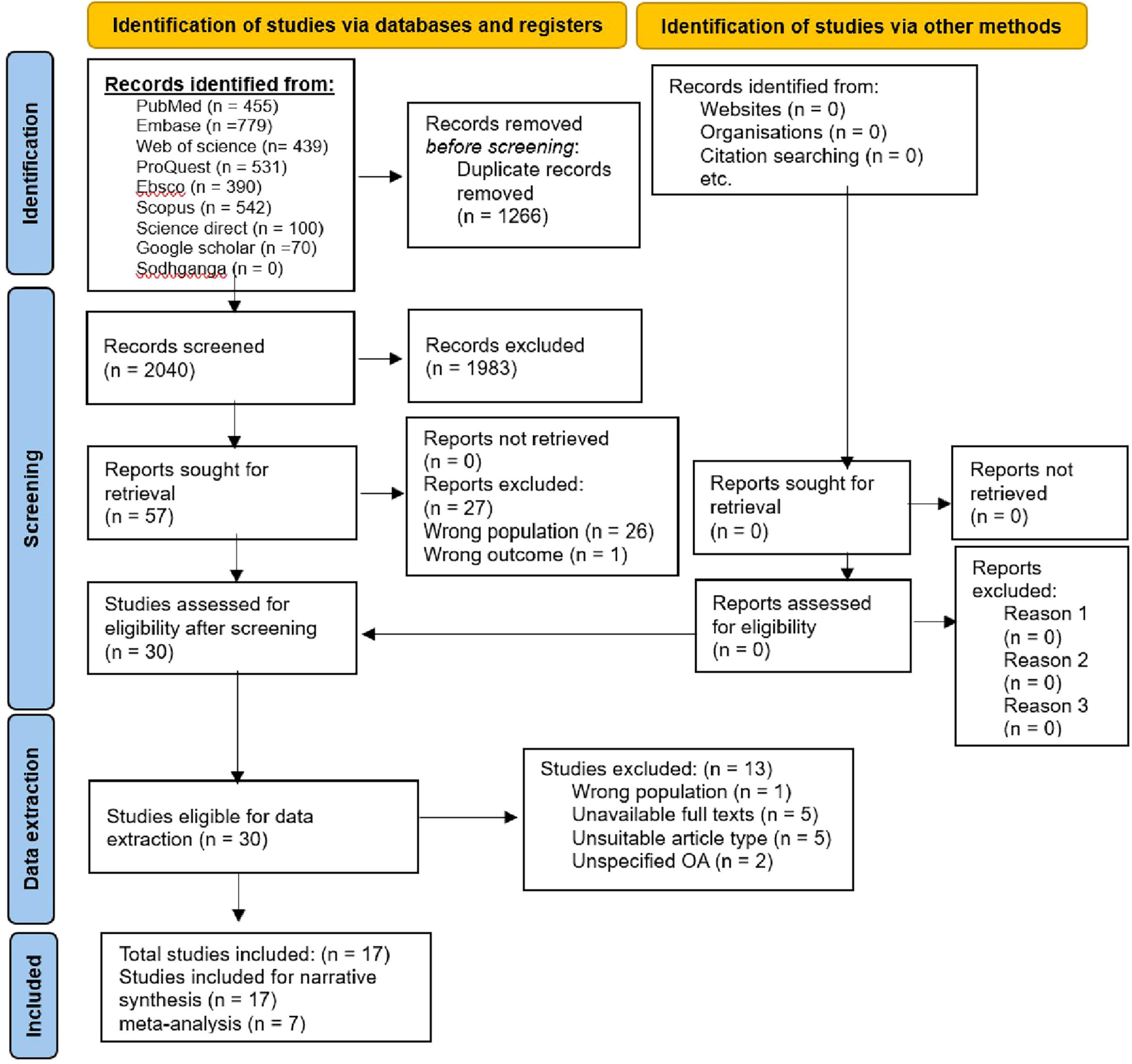 A total of 3,306 relevant articles were retrieved. Following deduplication, 2,040 articles were screened. After the title-abstract review, 30 articles met the inclusion criteria. Following a full-text review, 13 articles were excluded, including five due to unavailability of full texts, five with unsuitable article types, and three that did not specify the type of osteoarthritis or focused on conditions other than knee or hip osteoarthritis. Ultimately, 17 articles were included in this study.