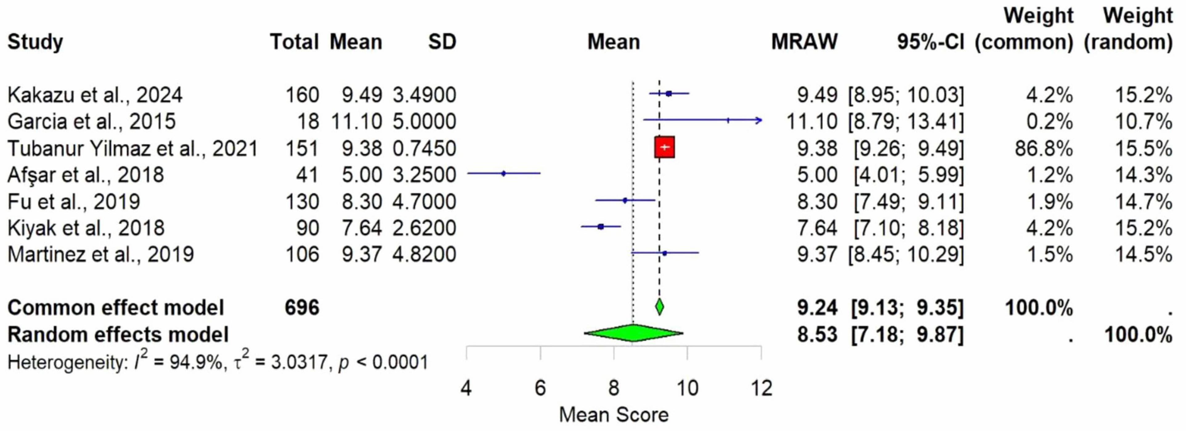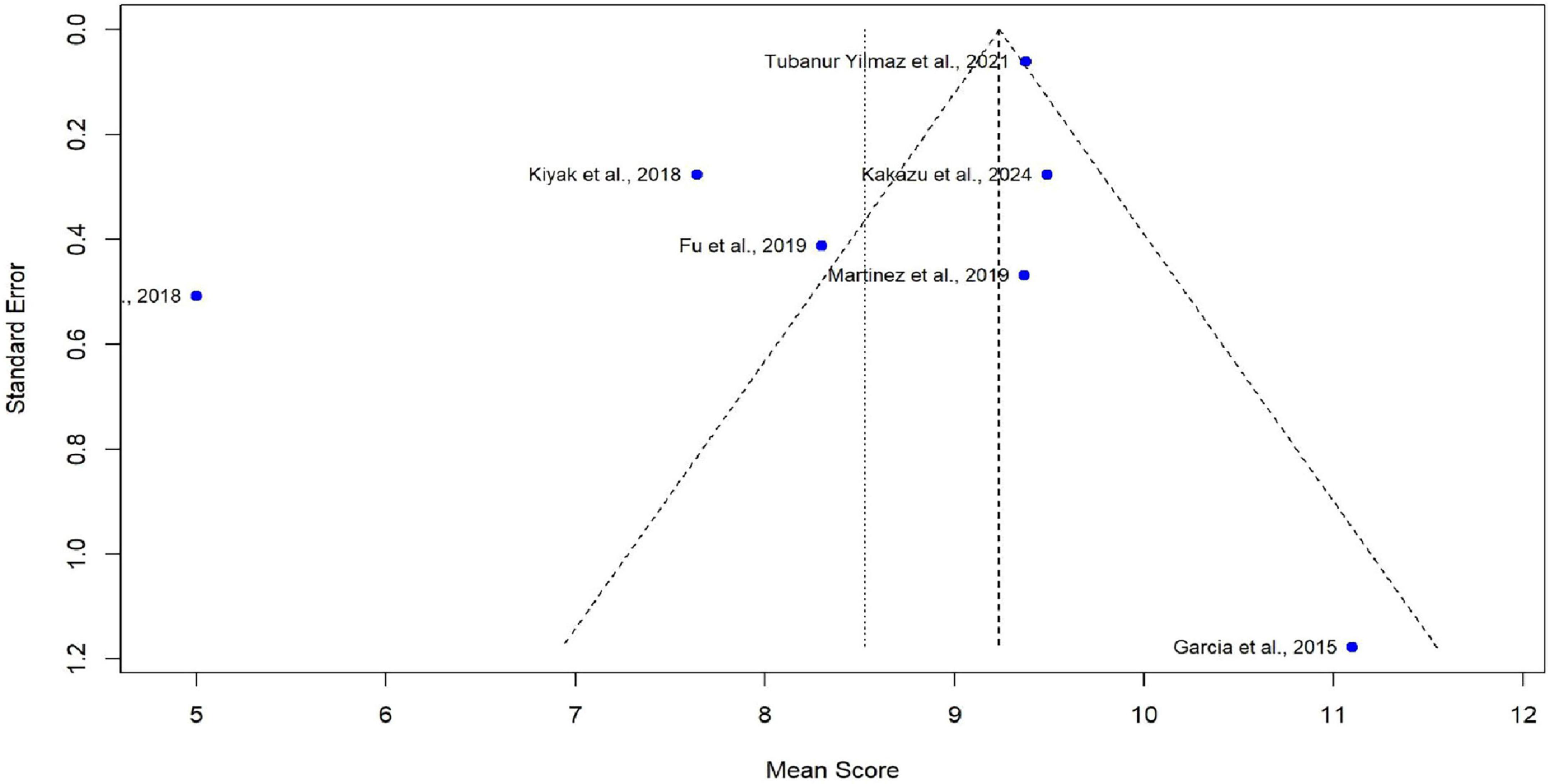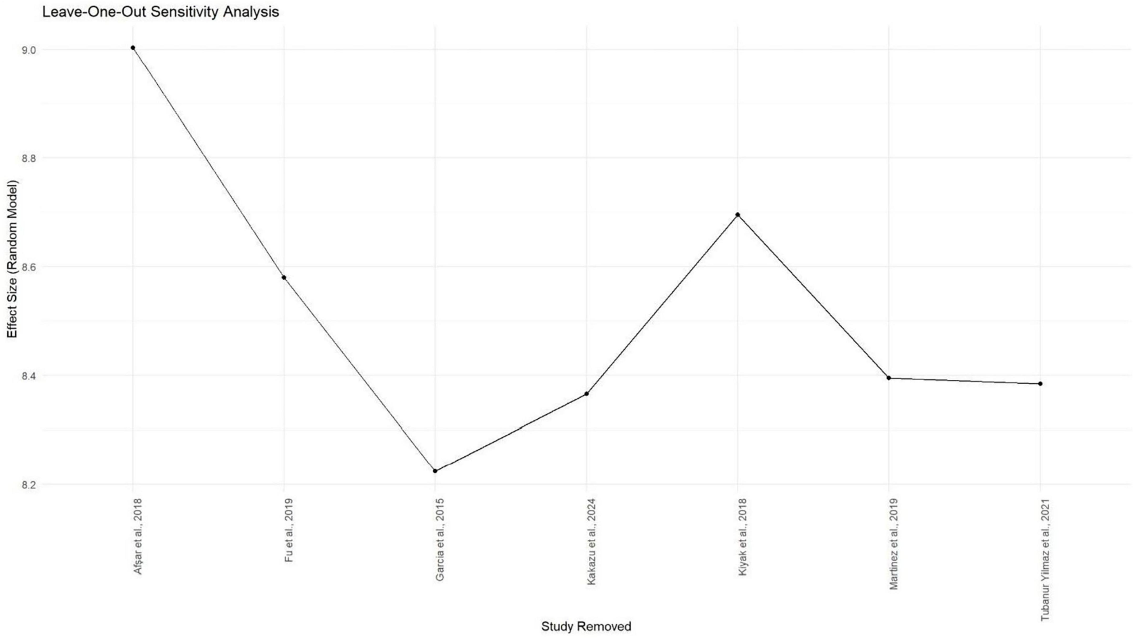 Meta-analysis was conducted using seven studies that employed a common sleep assessment tool, with PSQI score as the outcome measure for KHOA patients, reported in terms of mean and standard deviation (Figures 2–4). The pooled mean PSQI score among individuals with KHOA was 8.53, which is above the standard cutoff of 5, indicating poor sleep quality. In other words, the average PSQI score among KHOA patients was 8.53, which exceeds the established threshold of 5 for poor sleep quality. So, we can be 95% confident that the true effect size lies within the interval 7.18–9.87, indicating a statistically significant overall effect. The relatively narrow confidence interval suggests a precise estimate with a low likelihood of results occurring by chance. Heterogeneity analysis revealed substantial variability across studies, with an I2 of 94.96%, indicating extremely high heterogeneity. A p-value < 0.0001 and H2 = 39.31 further confirm considerable heterogeneity. The estimated level of variance (τ2 = 3.0317) across studies justified the application of the random-effects model in the meta-analysis. The forest plot showed that Afsar et al. (22) had the lowest mean score (5.00), while Alburquerque-García et al. (24) had the highest (11.10). The funnel plot indicated an outlier in the lower-right region Alburquerque-García et al. (24), suggesting potential true heterogeneity due to variations in study populations. A leave-one-out sensitivity analysis was performed to evaluate the robustness of a meta-analysis systematically and to identify whether a single study had a disproportionate influence on the overall results. Ggplot showed that removing Afşar et al. (22), Alburquerque-García et al. (24) significantly impacted the effect size, increasing it to approximately 9.0 or decreasing it to around 8.2, respectively, highlighting heterogeneity in the overall estimate. This high heterogeneity (I2 = 94.96%) makes interpretation of the pooled estimate more challenging. Several factors may explain this variability. First, differences in study populations could have contributed; some studies included younger patients, while others had older or more severe cases, which can affect sleep patterns. Second, cultural and regional differences in sleep habits and healthcare access may have influenced the reporting of PSQI. Third, although all studies used PSQI, the application of the tool may have varied (for example, in cut-off thresholds, versions used, or interviewer versus self-administered assessments). Fourth, differences in study design and sample size may also contribute to variability. Finally, co-morbidities such as depression, obesity, or medication use were inconsistently reported across studies and might explain variations in sleep quality.