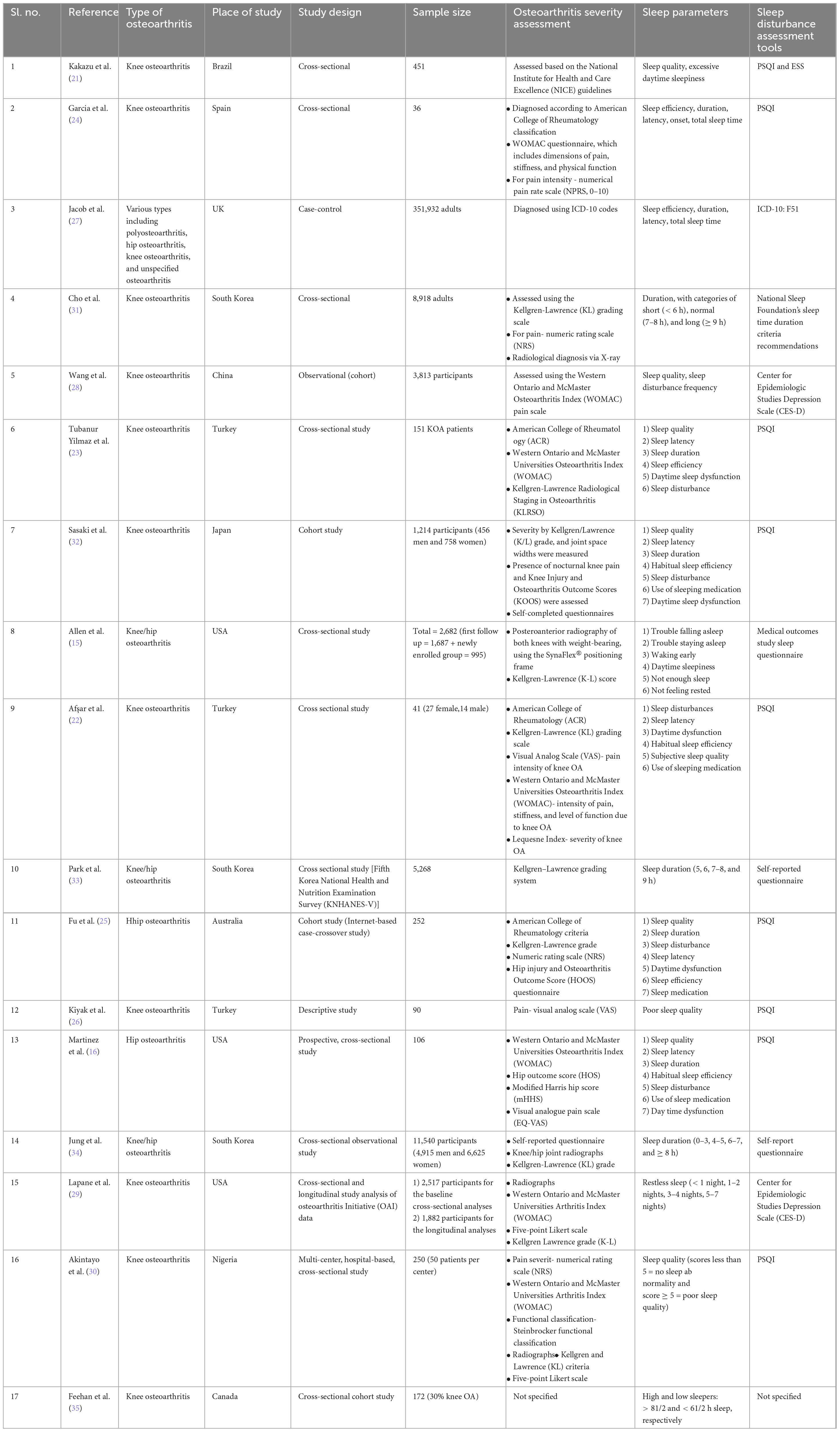 Methods: A systematic review and meta-analysis were conducted following the Preferred Reporting Items for Systematic Reviews and Meta-Analyses (PRISMA) guidelines. Comprehensive searches were performed across multiple electronic databases, including Medline via PubMed, EMBASE, CINAHL via EBSCO, Scopus, Web of Science, and ScienceDirect. Additionally, gray literature was sourced through Google Scholar, ProQuest, and Sodhaganga. Studies focused on sleep quality, disturbances, and related factors among individuals with KHOA were screened. Finally, 17 articles were included in the final analysis.