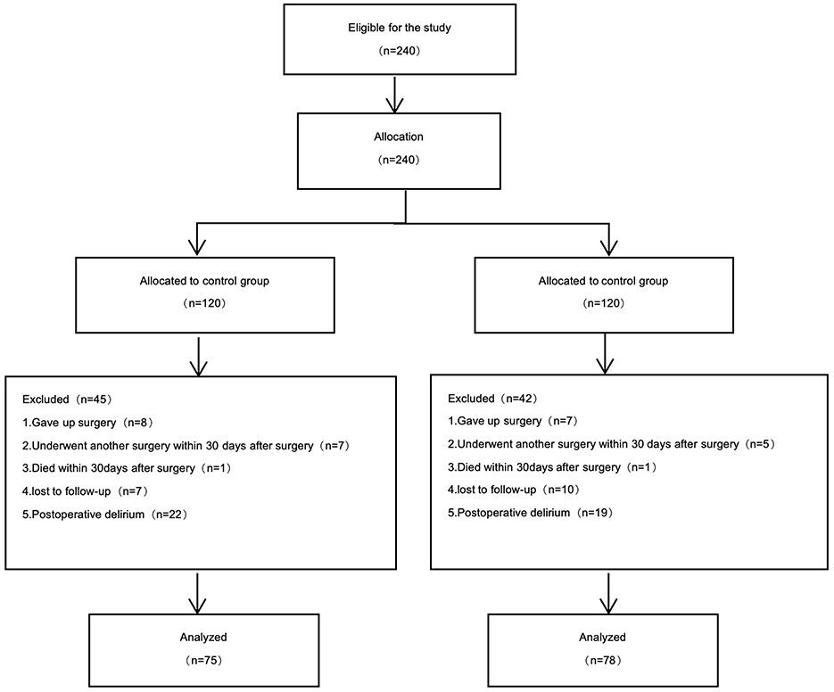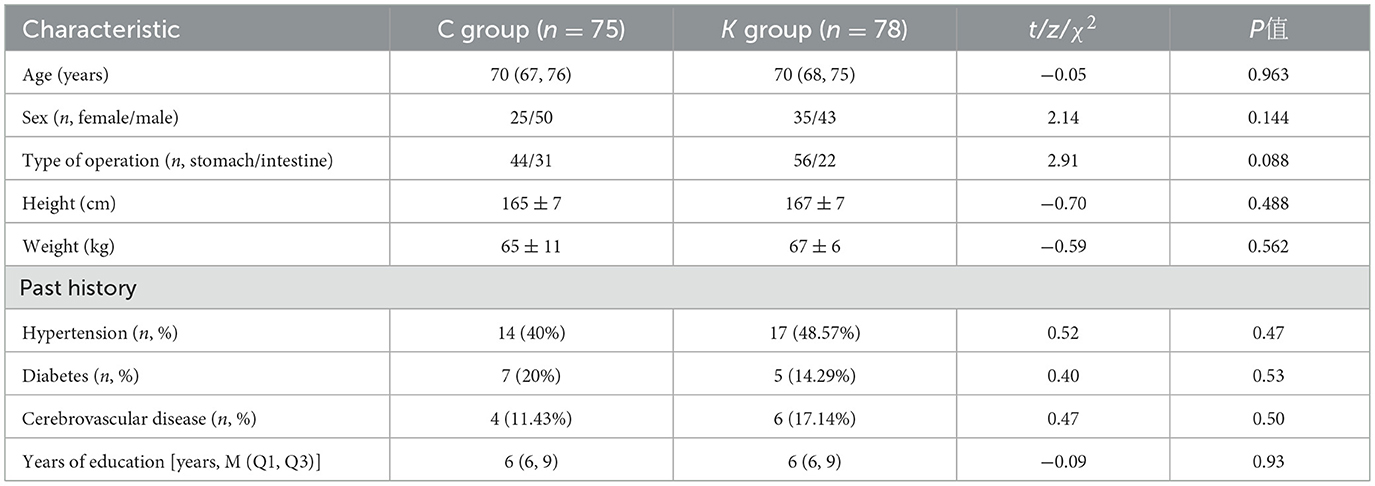 Among the 240 subjects included, 15 patients gave up surgical treatment due to tumor metastasis, 12 patients underwent another surgery within 30 days after surgery, 2 patients died within 30 days after surgery, 17 patients were lost to follow-up to the postoperative scale, and 41 patients suffered from postoperative delirium. Overall, 153 patients were included in the data analysis; 75 patients were in group C, and 78 patients were in group K (Figure 1).