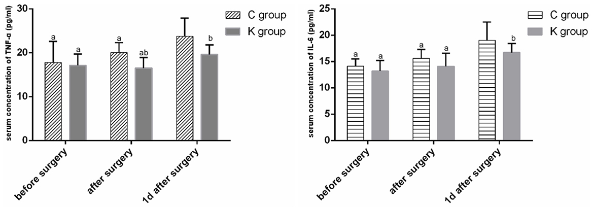 Serum TNF-ɑ and IL-6 concentrations were greater in both groups 1 day after surgery than before and after surgery (P < 0.05). The serum TNF-ɑ concentration was lower in group K after surgery and 1 day after surgery than in group C, and the serum IL-6 concentration decreased 1 day after surgery (P < 0.05) (Figure 2).