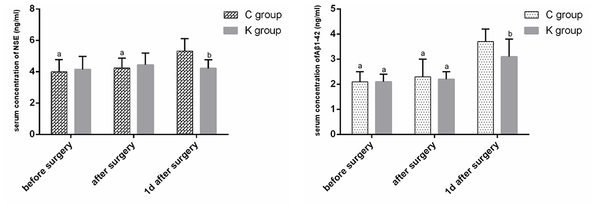 Figure 3. Serum concentrations of NSE and Aβ1-42 over time. aP < 0.05 vs. 1 day after surgery. bP < 0.05 vs. C group.