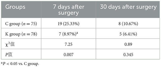 The incidence of PND at 7 days after surgery was significantly lower in group K (8.97%) than in group C (25.33%) (P < 0.01). Moreover, there was no significant difference between the two groups in terms of the incidence of PND at 30 days after surgery (P > 0.05) (Table 2).